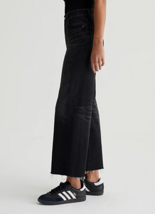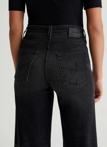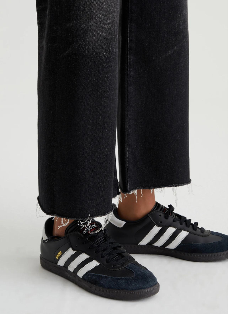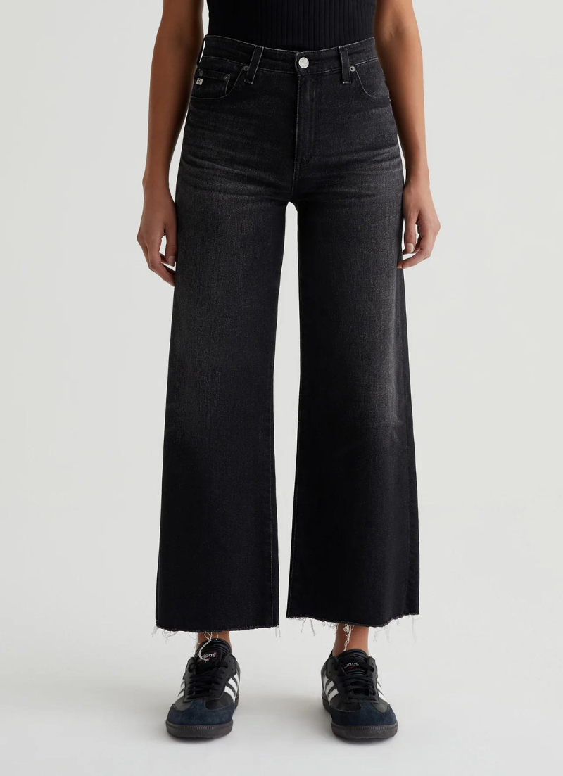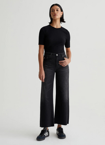 Le Saige Wide Leg Crop est un jean taille haute avec des jambes amples et raccourcies et des ourlets bruts. Cette paire noire délavée est disponible dans nos 8,7 oz. Denim noir hypersoft avec un fondu AG-ed™ de 6 ans. Les tissus AG Cloud Soft Denim™ présentent une construction spéciale en sergé à gauche, permettant aux fils de se détendre et de se détordre doucement pour une sensation souple qui devient plus douce à chaque utilisation. L'étirement à double élasticité offre un confort supplémentaire et une forme résiliente. Le mannequin porte une taille 26.
