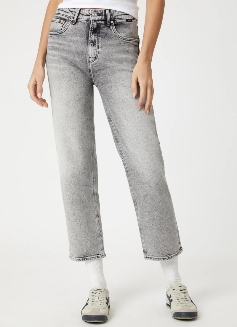 Straight leg jeans with some edge, this pair is designed with a cropped leg and smoky grey wash in vintage-inspired denim with heavy washing and fading. Recycled fibers bring a sustainable twist.