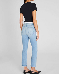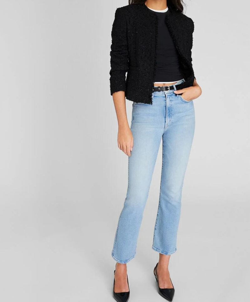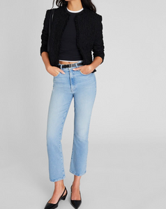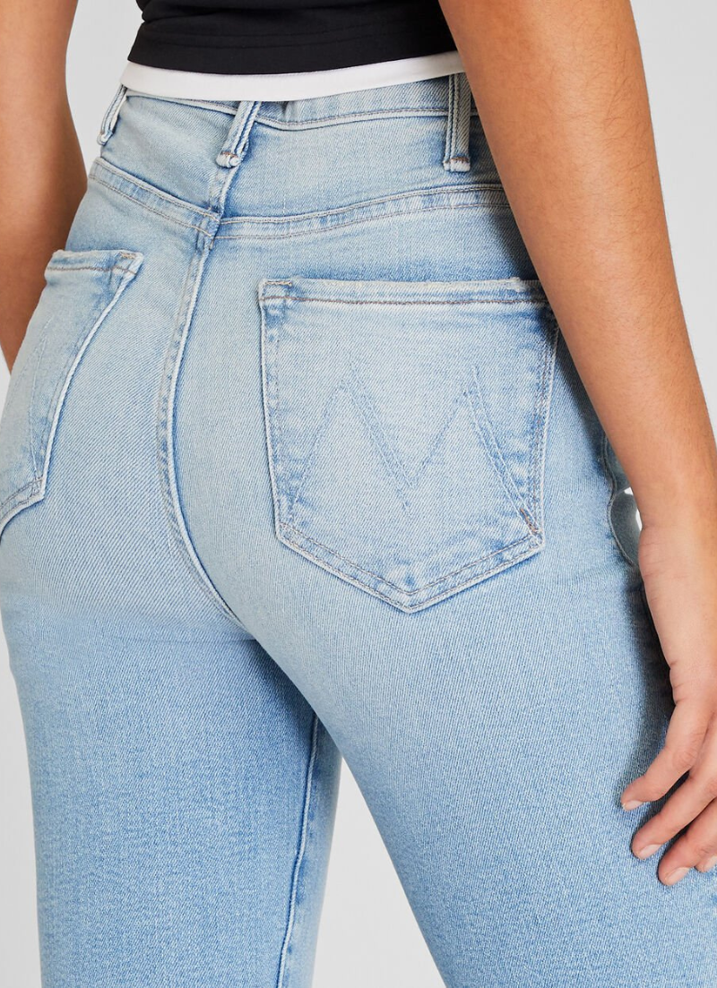 A light blue wash with whiskers and fading gives these high-waisted jeans a vintage feel. Designed with a flared leg, ankle-length inseam, and just the right amount of stretch. From MOTHER, a Los Angeles-based denim brand with a penchant for innovation.