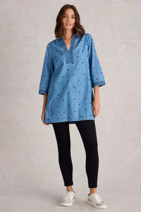 Experience the perfect combination of comfort and style with our Blaire Denim Embroidered Tunic! This classic fit tunic features 3/4 sleeves and a soft, flowy denim fabric that will keep you feeling effortlessly chic. With beautiful embroidery all over, this tunic adds a touch of bohemian charm to any outfit. Elevate your wardrobe today with our must-have tunic!