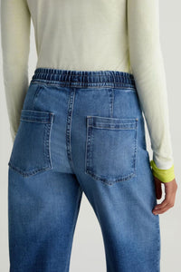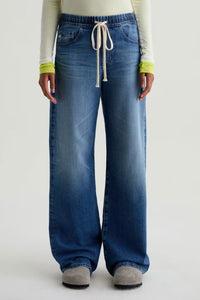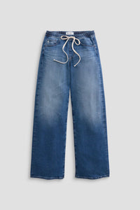 Meet your new favorite jean. The Adria Cinched Low-Rise Wide Leg features a self-tie drawstring that cinches just below the waist, giving you a custom fit that moves with you. Crafted from premium Daytripper Stretch Denim sourced from Japan's legendary Kaihara Mill, these jeans blend comfort with style. The low-rise cut sits perfectly on the hip while the loose, wide leg creates an effortlessly cool silhouette that puddles at the hem. Finished in Copenhagen—a medium blue wash with whiskering, fading, and subtle texture—these are the jeans you'll reach for again and again.