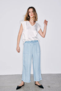 Introducing Lans Denim Pants - the ultimate in playful comfort! These gaucho pants are made of bleached blue tencel denim, offering a unique and quirky twist on traditional denim. Get ready for a fun and fashionable look that will have you standing out from the crowd.