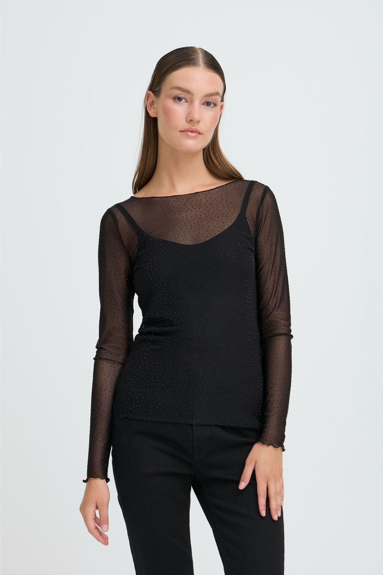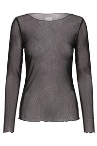 Mesh long sleeve top with allover polka dot texture. Fitted silhouette and round neckline. Sheer finish for a modern, effortlessly cool edge. Subtle rolled hem adds a delicate detail.