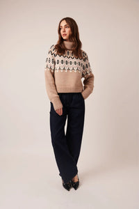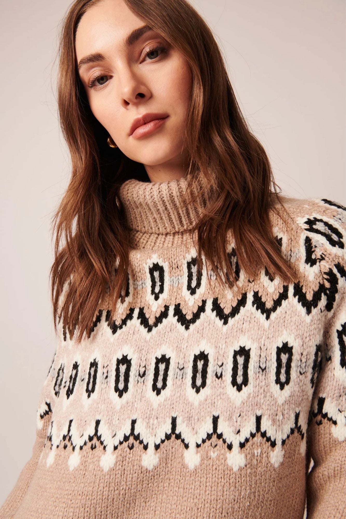 Meet Ruthie, the knit turtleneck with a playful fairisle print. Its thick, cozy knit is perfect for cooler seasons. Stay warm and stylish with Ruthie!