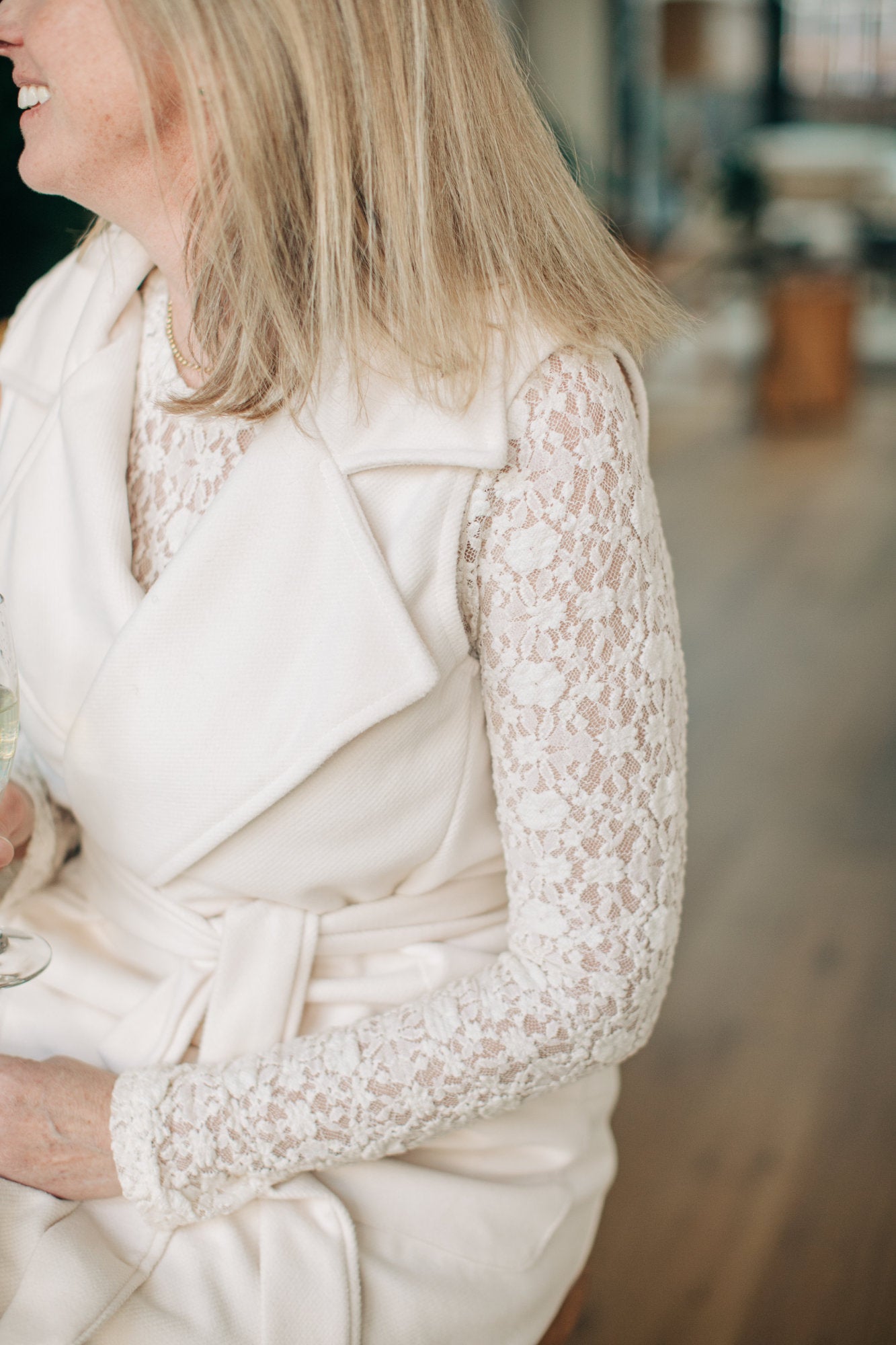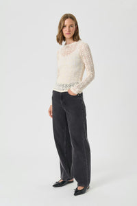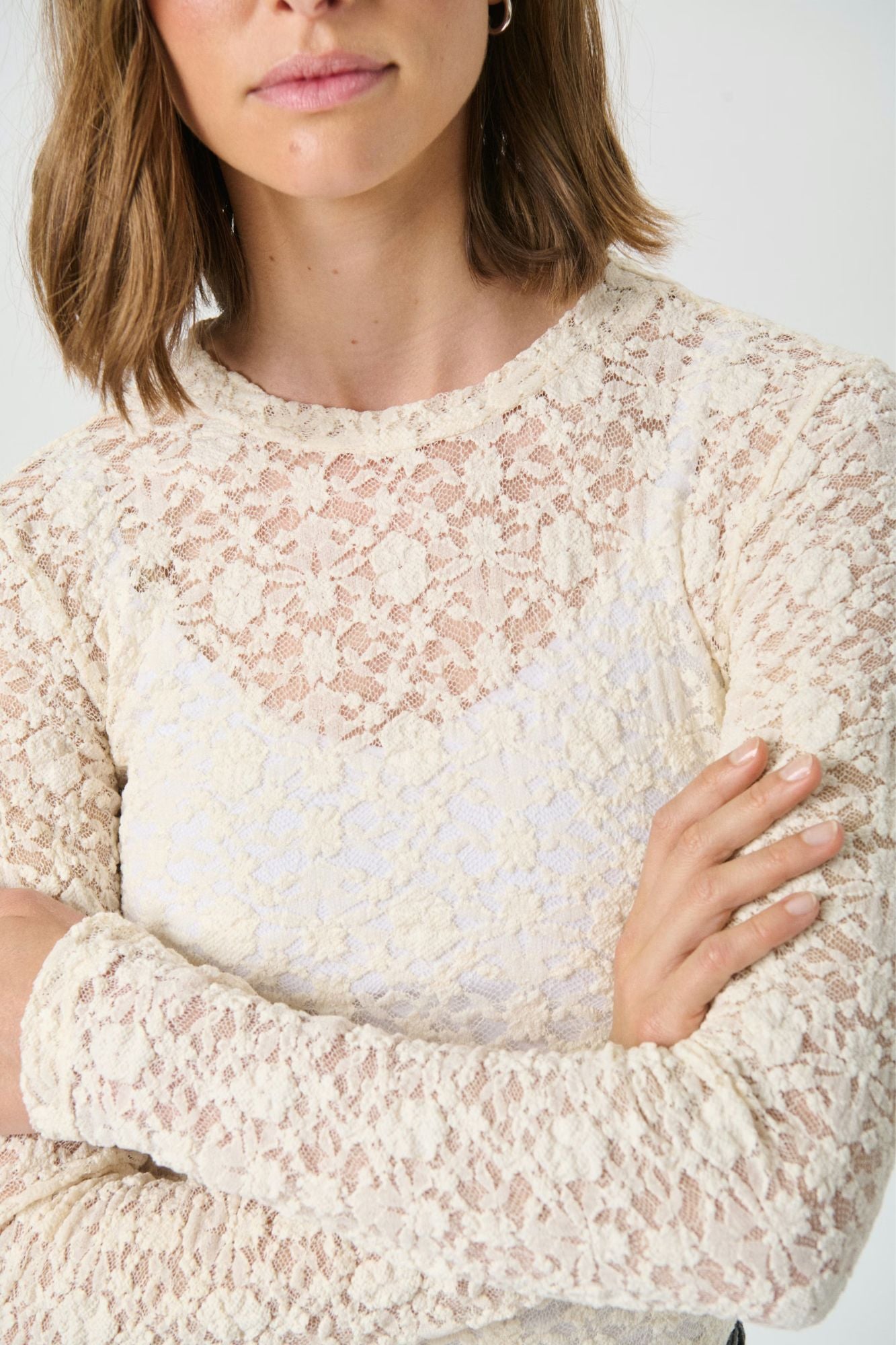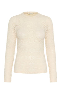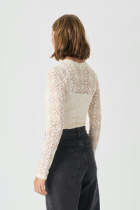 Meet the Venetia Top—your new go-to for effortless elegance. This ivory fitted lace beauty features delicate floral details and a soft, semi-sheer fabric that whispers sophistication. Long sleeves and a classic round neckline keep things refined, while the fitted silhouette flatters every frame. Layer it under a crisp blazer for polished professionalism, or pair it with edgy jeans for a playful contrast that totally works. Whether you're dressing up for something special or elevating your everyday style, this versatile piece does the heavy lifting—because looking put-together should be this easy.