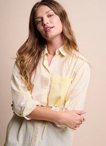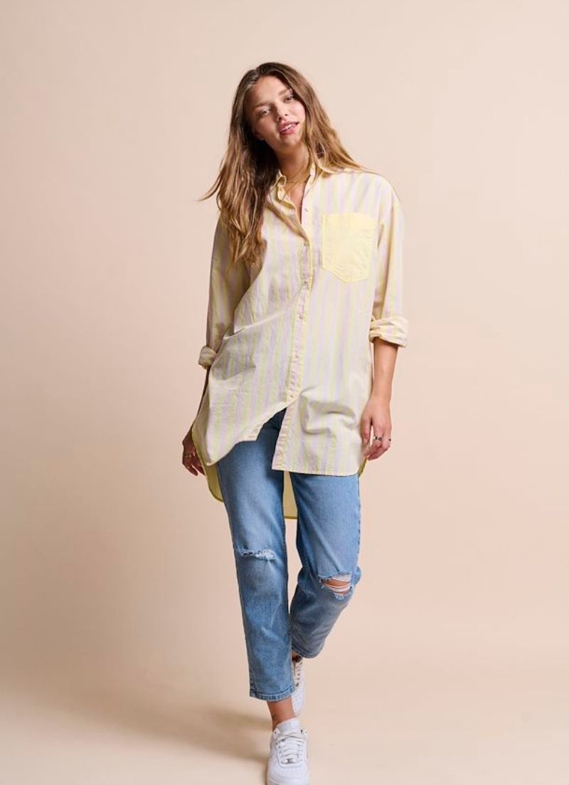 Une chemise de coupe ample, au-dessus du genou, dotée de manches retroussées et ultra légère.
