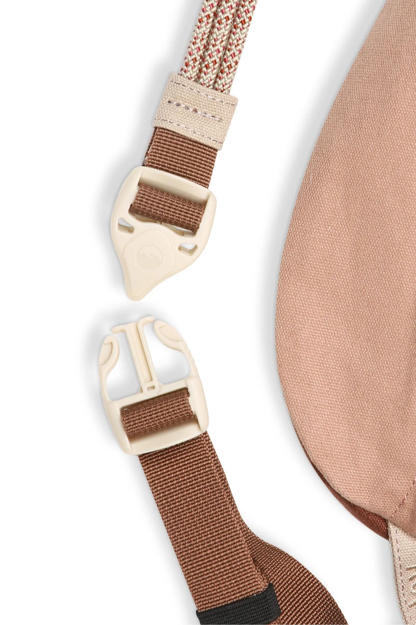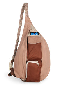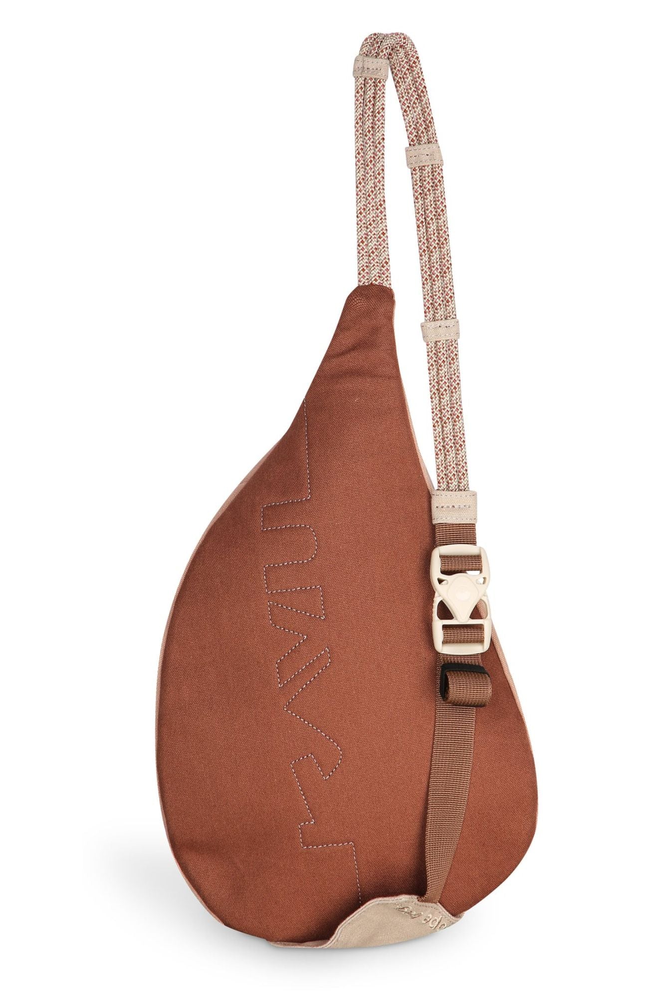 This mini sling cotton canvas pack features adjustable rope shoulder strap with side release buckle, two vertical zip compartments, two key or cell phone pockets, padded back with KAVU embroidery.