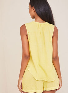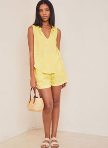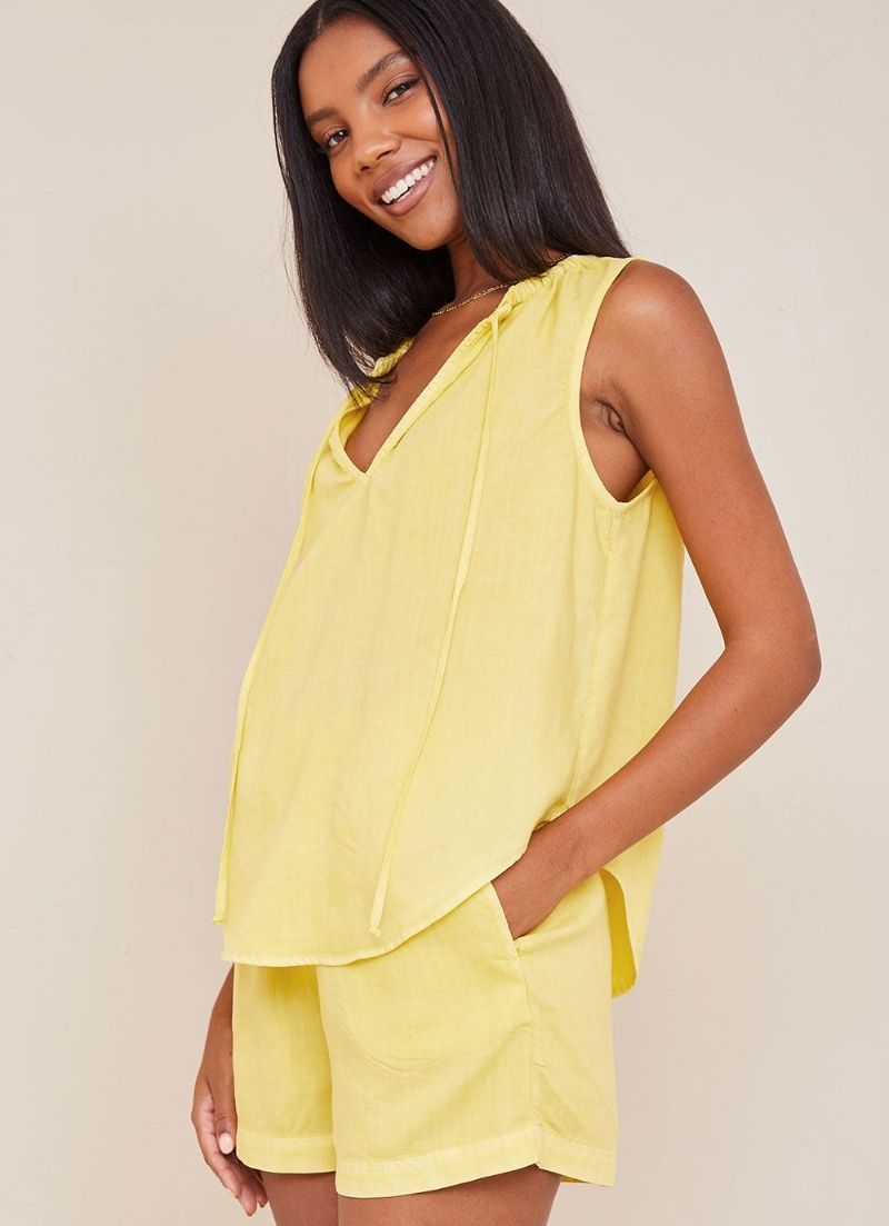 Un haut pull sans manches à col en V froncé avec des liens à nouer au cou.