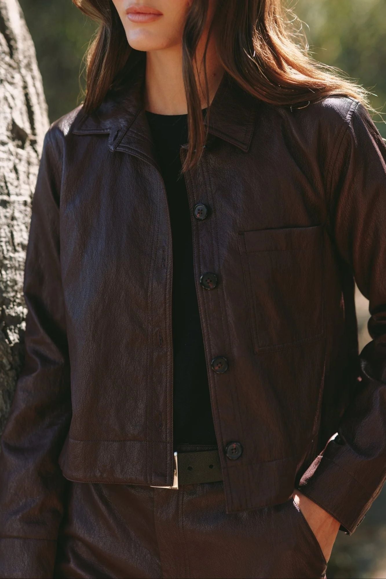 Meet your new go-to layer—the Crop Pocket Button Down. This playful take on a classic pairs a cropped silhouette with buttery soft faux leather that feels as good as it looks. The structured button-down front and collar keep things polished, while the relaxed fit keeps things real. Whether you're layering over a tee or wearing solo, this versatile piece brings effortless style to your everyday rotation. Comfort meets edge in one seriously wearable piece.