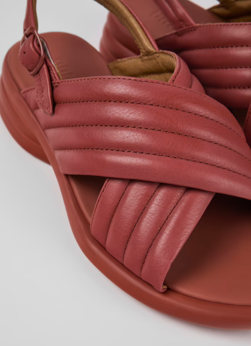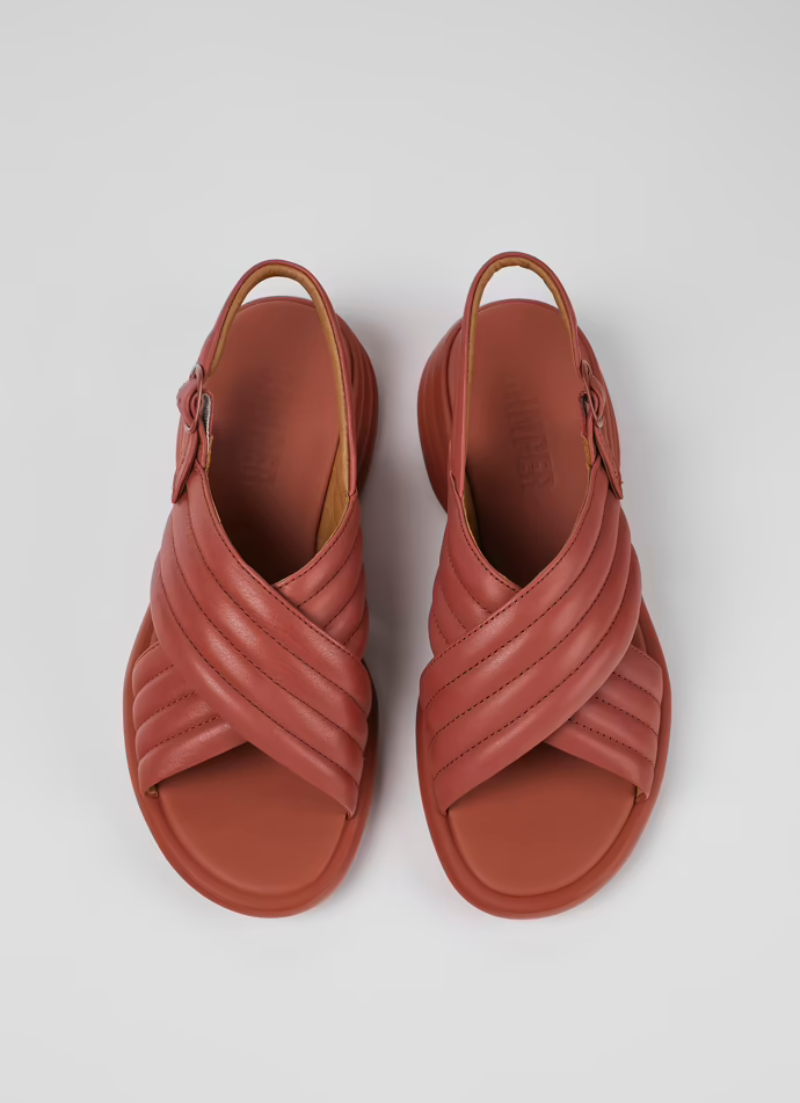Red women's cross-strap sandals with water-saving leather, leather linings, recycled OrthoLite® footbeds, and 100% EVA outsoles.