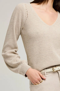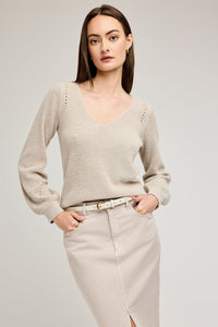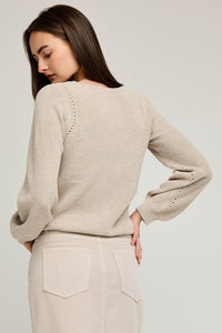 The Hailey Pullover Sweater is made of our beloved heathered yarn, creating a effortlessly feminine look. The v-neckline, balloon sleeves, and pointelle stitch detailing add flattering touches. Perfect for a cozy yet sophisticated ensemble.