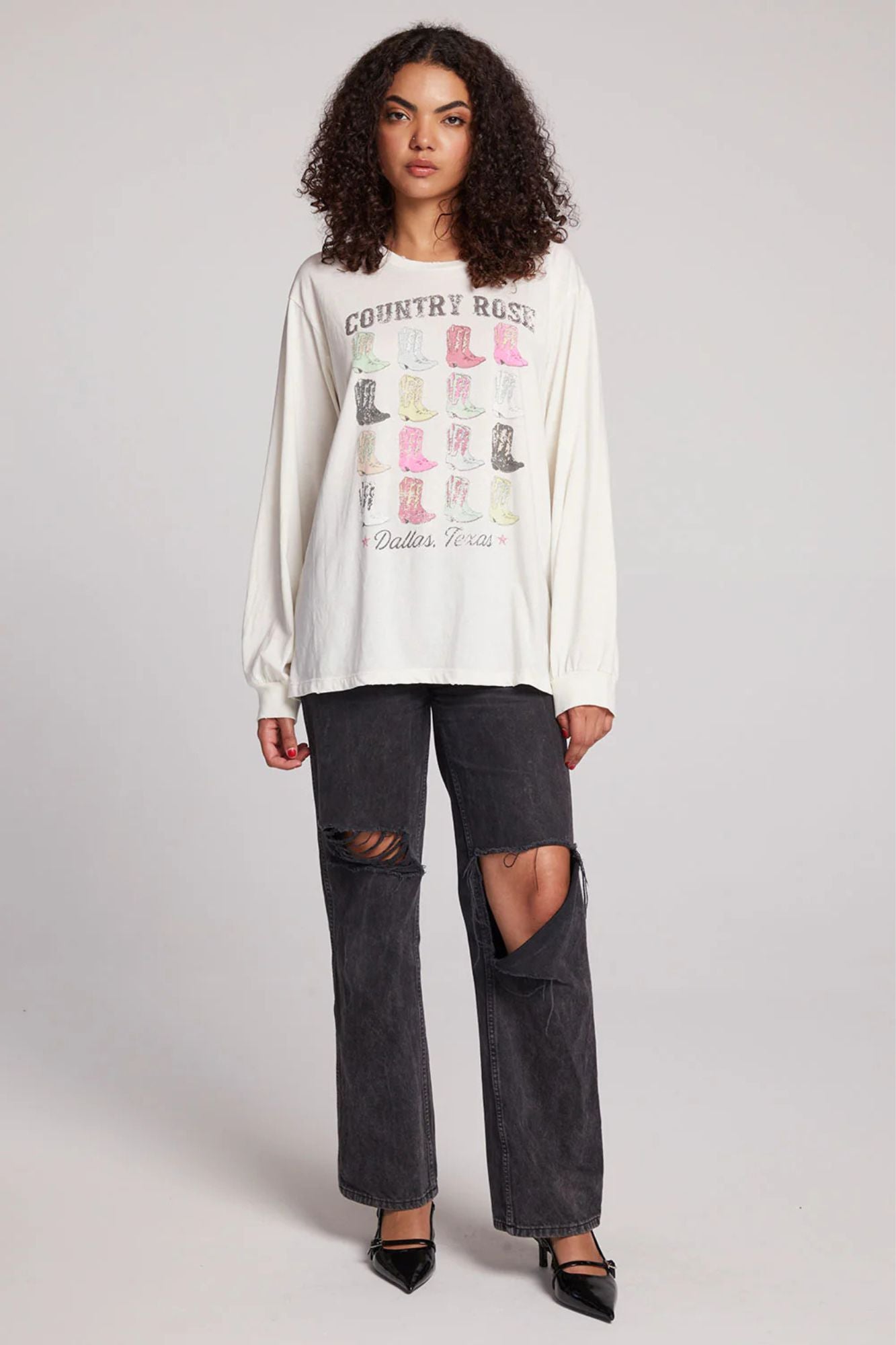 Saddle up in style with our Cowboy Boots Long Sleeve! Featuring a retro rainbow design that adds a touch of hip nostalgia to any outfit. The starry white boxy boyfriend fit is effortlessly chic and perfect for walkin'. Pair it with black jeans and boots for a stylish and playful look. Yeehaw!
