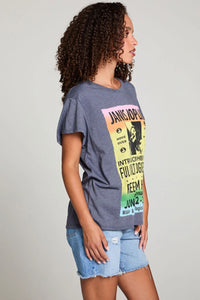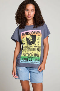 Experience the unforgettable energy of Janis Joplin with the Freedom Hall tee. This slate blue tee showcases a gradient rainbow poster print, transporting you back to the iconic era of peace and love. Embrace your inner rockstar and relive the magic of Janis Joplin with every wear.