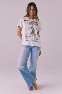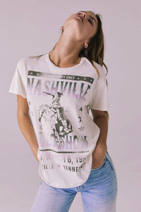 Embrace the spirit of country living with the Nashville Rodeo Tee. Featuring a vintage-inspired design and a softly faded print in a starry white shade, this tee captures the essence of Nashville’s charm. Its exclusive style and subtle, refined details make it a standout piece that effortlessly elevates your casual wardrobe. Perfect for those who want to showcase their inner cowgirl with a touch of sophistication.