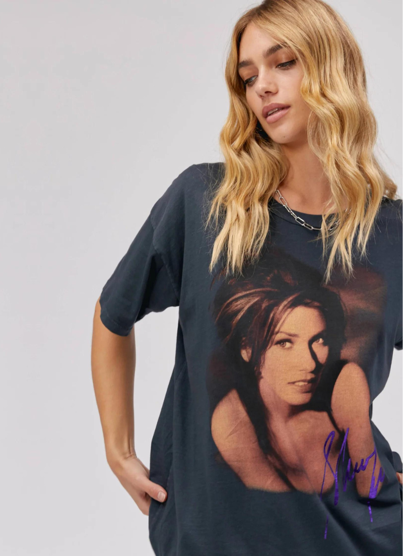 La reine de la country pop, faut-il en dire plus ? Connu comme l'une des tournées les plus attendues des années 90, le premier concert de Shania Twain, your 'come on over', a été nommé « Country Tour de l'année » - ce n'est pas une surprise pour l'une des artistes d'autonomisation féminine les plus populaires du moment. Un portrait de Shania Lands Center avec son autographe tamponné accentué sur du papier d'aluminium et les détails de la visite au dos. Montrez votre esprit Shania qui va et vient. Le mannequin porte une taille S.