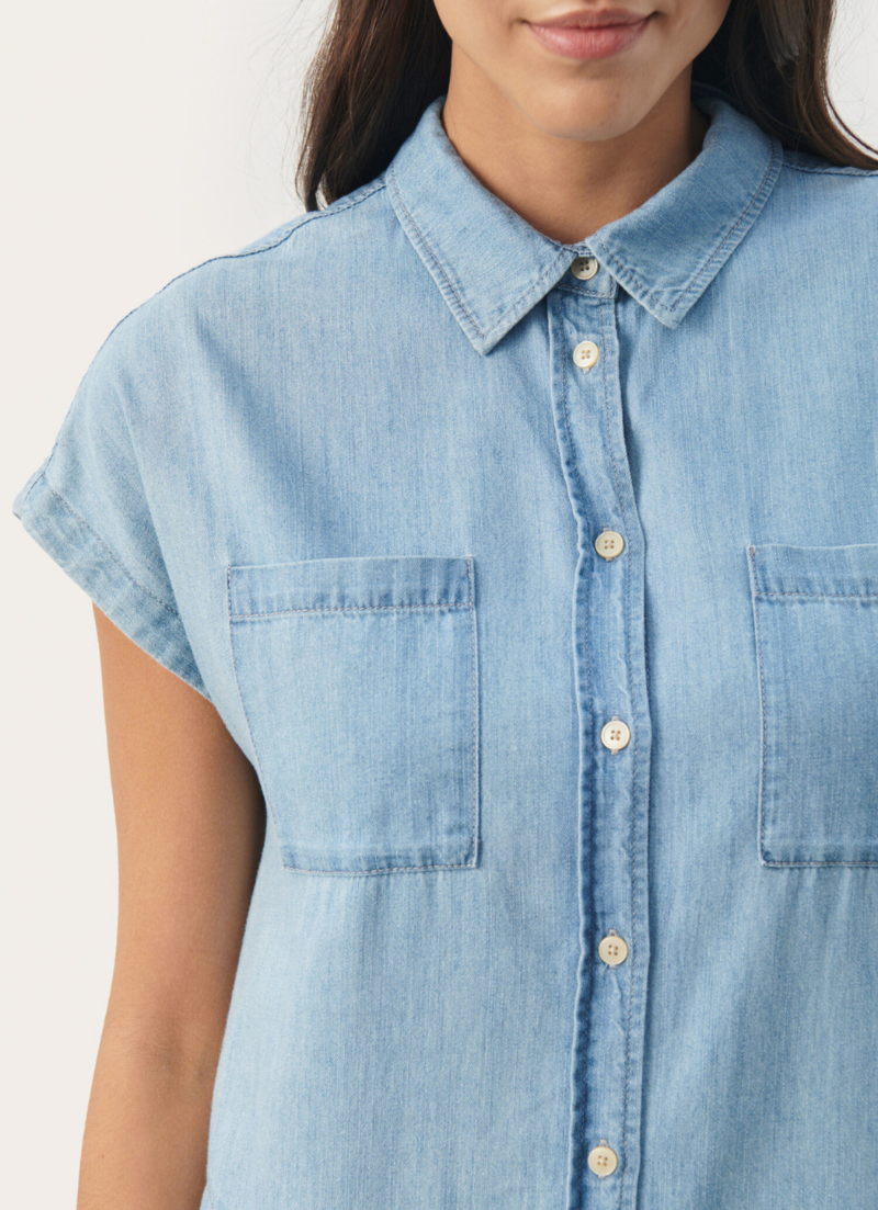 Part Two a pris une robe chemise en jean classique et l'a mise à jour avec un corps droit et des mancherons. Cette robe Ellena est super facile à porter avec des baskets toute la saison.