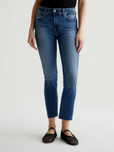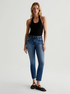 Our Mari Crop is a high-rise slim straight jean with worn hems that land just above the ankle. These high-waisted jeans fit easy around the hips and feature a straight-leg silhouette with a slim finish. Crafted from 10 oz. Empower superstretch denim, the pair comes in a dark blue wash that's been faded and whiskered to emulate 14 years of vintage wear. Subtle grinding softens the edges of the classic five-pocket design.