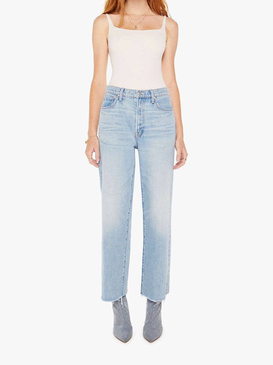 Backstage pass. High-waisted jeans with a wide straight leg, zip fly and ankle-length inseam with a frayed hem. Cut from SUPERIOR 100% cotton denim, I'm With The Band is a light blue wash with subtle whiskering and fading throughout.