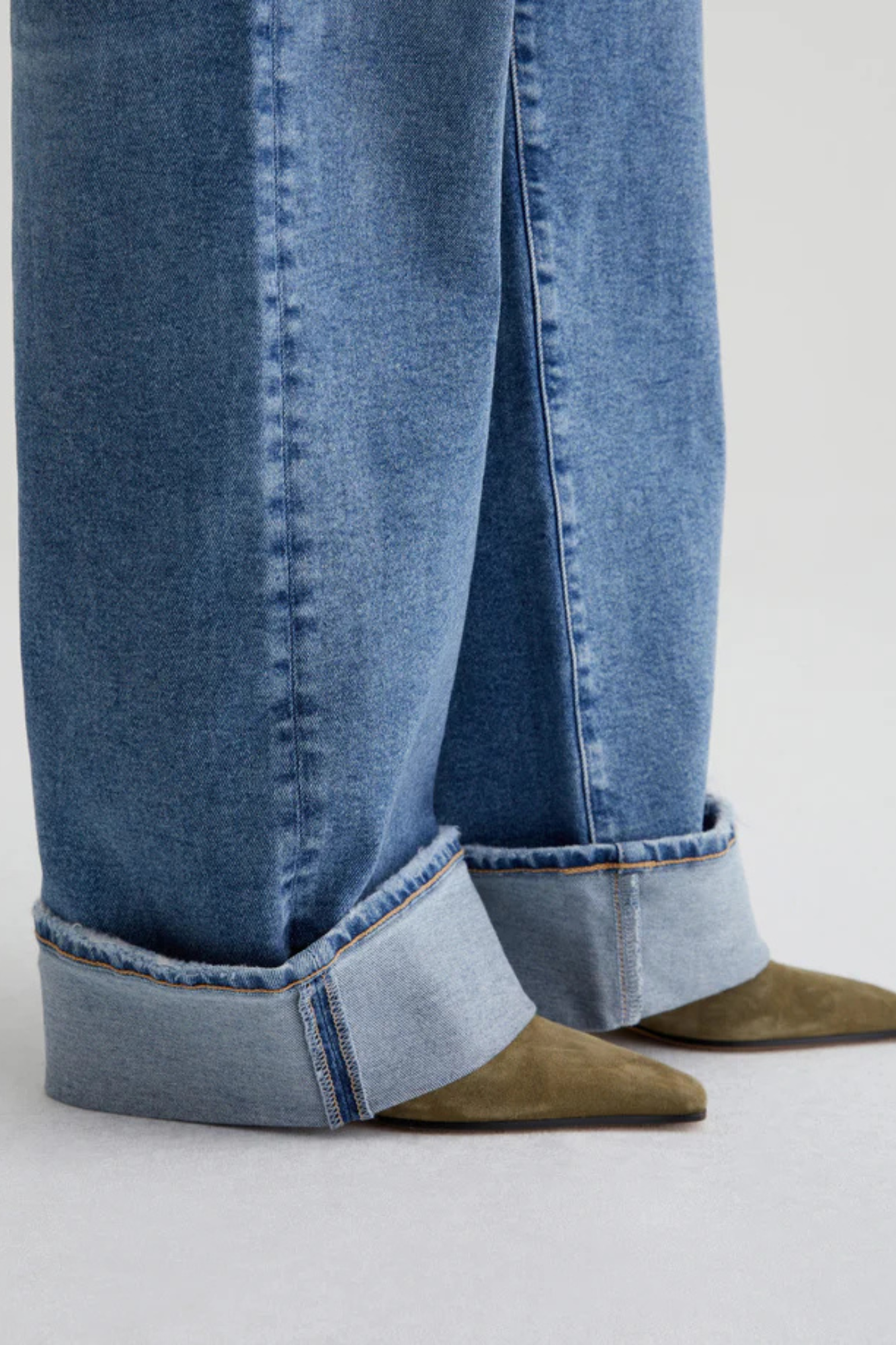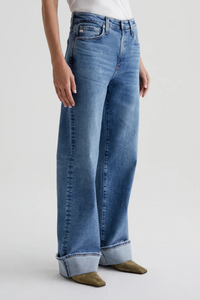 Introducing Kora, the perfect pair of wide-leg jeans with an ultra-high rise, loose and easy fit, and crafted in Italy from 12 oz. Classic Comfort Stretch Denim for all-day comfort. Get ready to make a statement with the medium blue wash, faded details, and worn hems, perfect for dramatic wide-cuff styling.