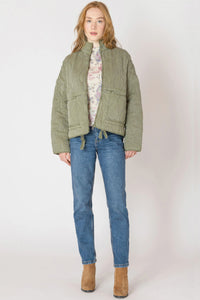 Stay cozy and stylish in this olive green quilted jacket that’s as fun as it is functional. With a zip-up front for easy wear, roomy patch pockets to stash your essentials, and an adjustable drawstring hem to tailor your look, it’s the perfect jacket to zip through your day with a playful twist.