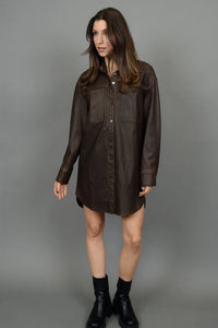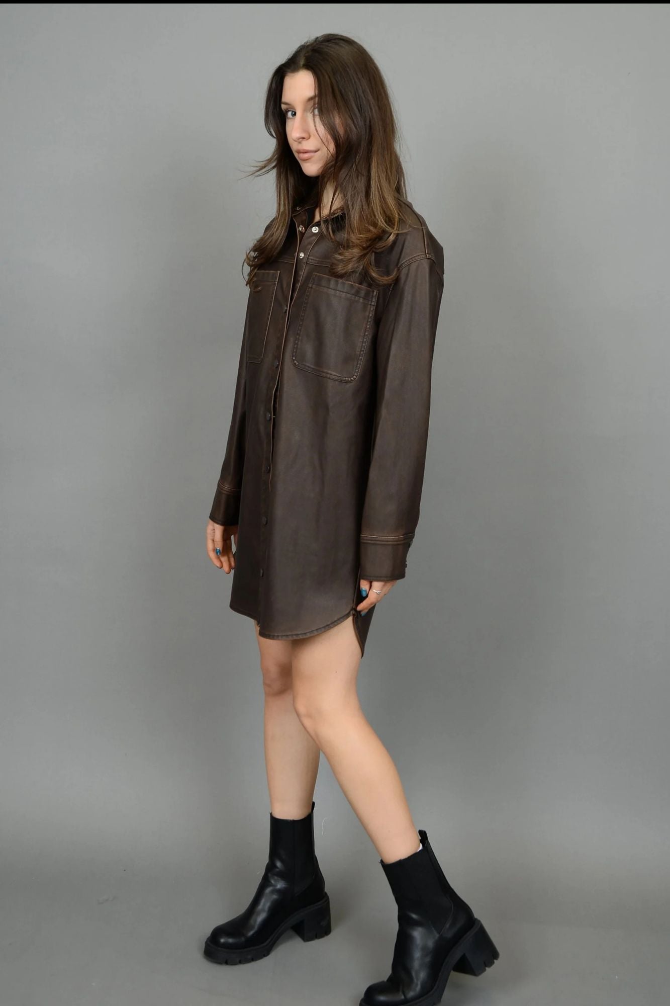 Elevate your style with the Aliska Faux Leather Dress. This snap front shirt dress exudes rugged charm, while the premium faux leather with a distressed finish adds a touch of contemporary elegance. Perfect for any occasion, pair it with boots or heels for a stylish statement.