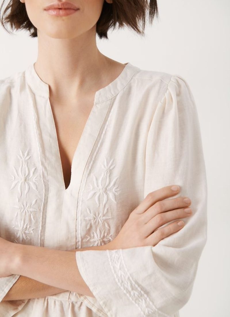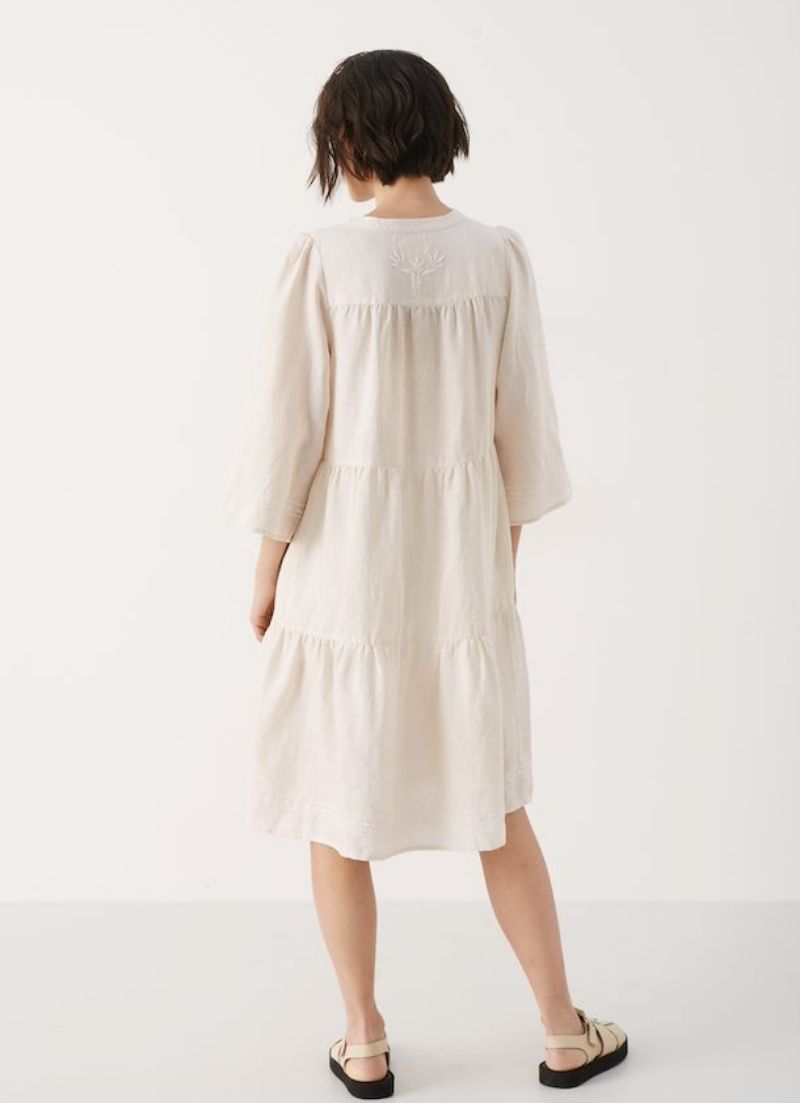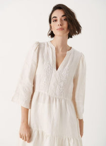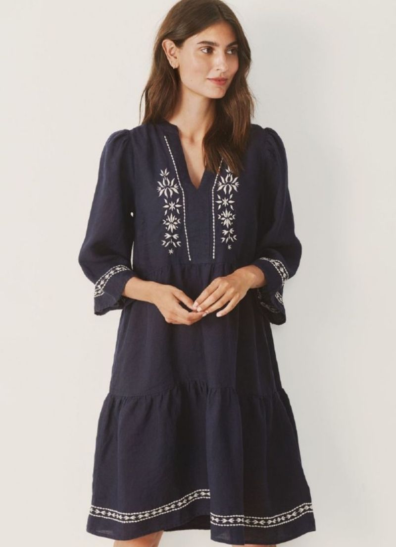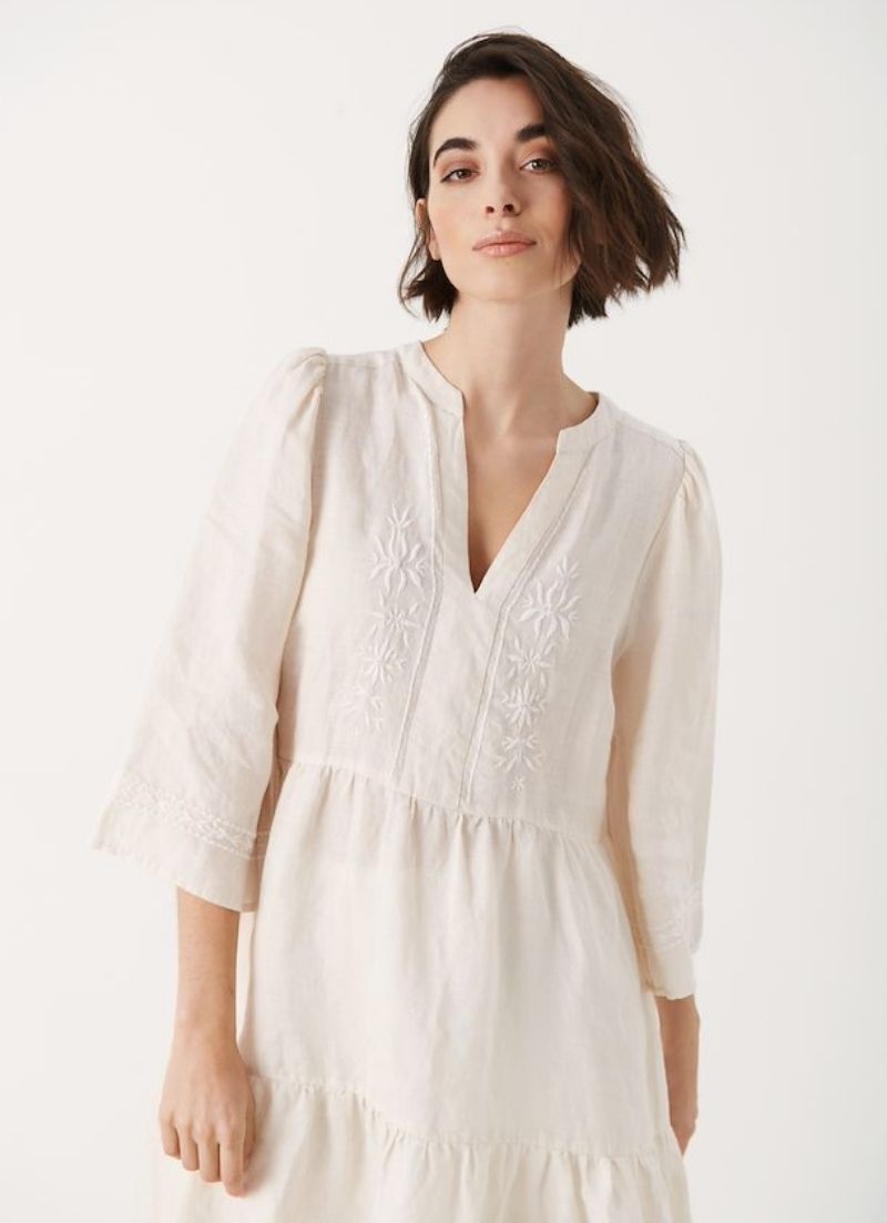 Cette robe en lin est parfaite pour les journées ensoleillées, vous gardant au frais et à l'aise. Avec une coupe décontractée, des manches 3/4 et une jupe fatiguée jusqu'aux genoux, complétée par une belle broderie sur la poitrine et les bordures.