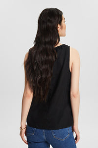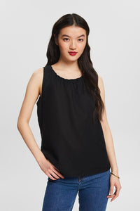 Pure, light and natural, this sleeveless blouse made from a blend of cotton and linen fabric has a noteworthy smocked round neckline, adding a touch of allure to the blouse.