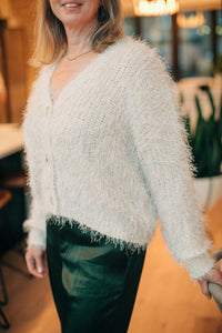 Get ready to snuggle up in our Cardigan Short Hairy! This must-have oversized sweater is perfect for chilly days, with its comfy fit and stylish puff sleeve. Plus, the button accents add a touch of charm. Cozy up in style with this one-of-a-kind cardigan.