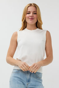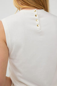 This sleeveless top is a versatile addition to any wardrobe. With its fine-knit fabric and gold snaps, it can be worn on its own, layered under a jacket, or over a blouse. Elevate any outfit with this simple yet stylish piece.