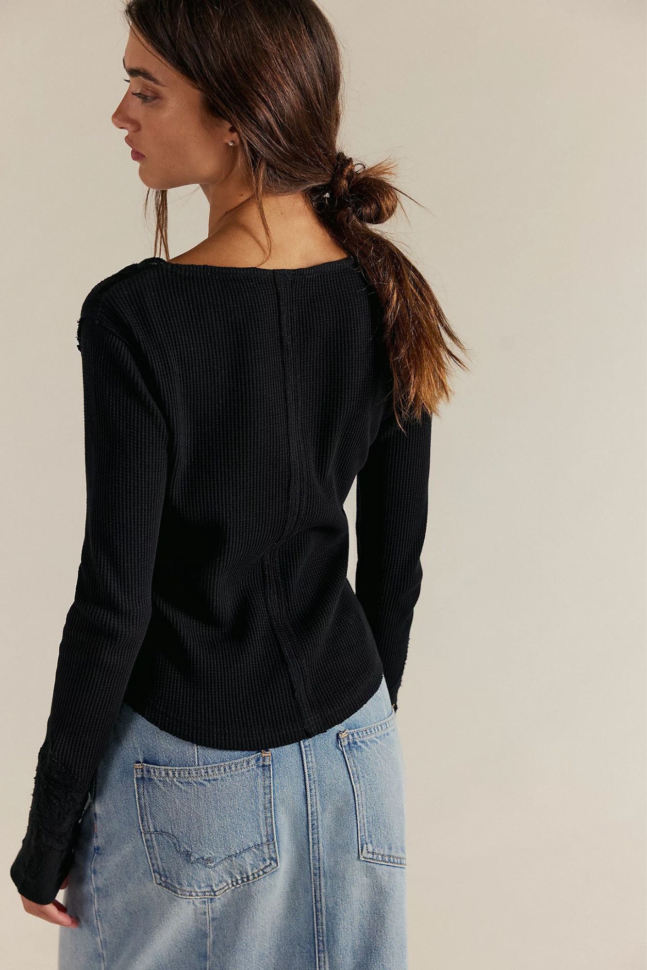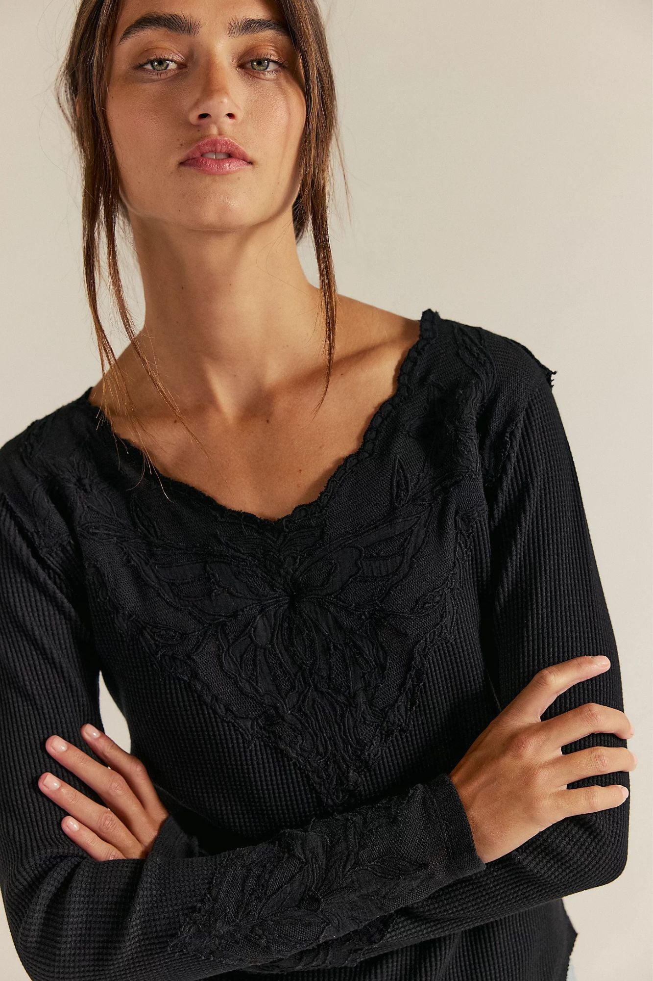This long-sleeve thermal elevates a familiar favorite with delicate embroidered mesh details at the chest and cuffs, creating a distinctive and elegant look. Perfect for adding a unique touch to your chilly-day wardrobe, it combines comfort with standout style for a truly special layering piece.