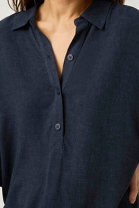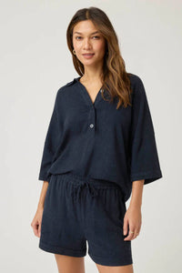 Embrace sunny days with the Coastal Top, designed for effortless comfort and style. Its breezy fabric and relaxed fit, featuring slouchy shoulders and three-quarter sleeves, keep you cool and carefree. The playful three-button placket and hi-low hem with side slits add a touch of charm, perfect for pairing with the Coastal Pant for a laid-back, beach-ready vibe.