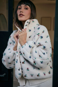 The Deeda Jacket transforms the classic bomber into a soft, fluffy essential featuring a delicate petite floral pattern. This captivating jacket infuses your wardrobe with a romantic and flirtatious charm, balancing timeless elegance and vintage grace. Elevate your style effortlessly by adding this sophisticated yet whimsical layer to your outfit rotation.