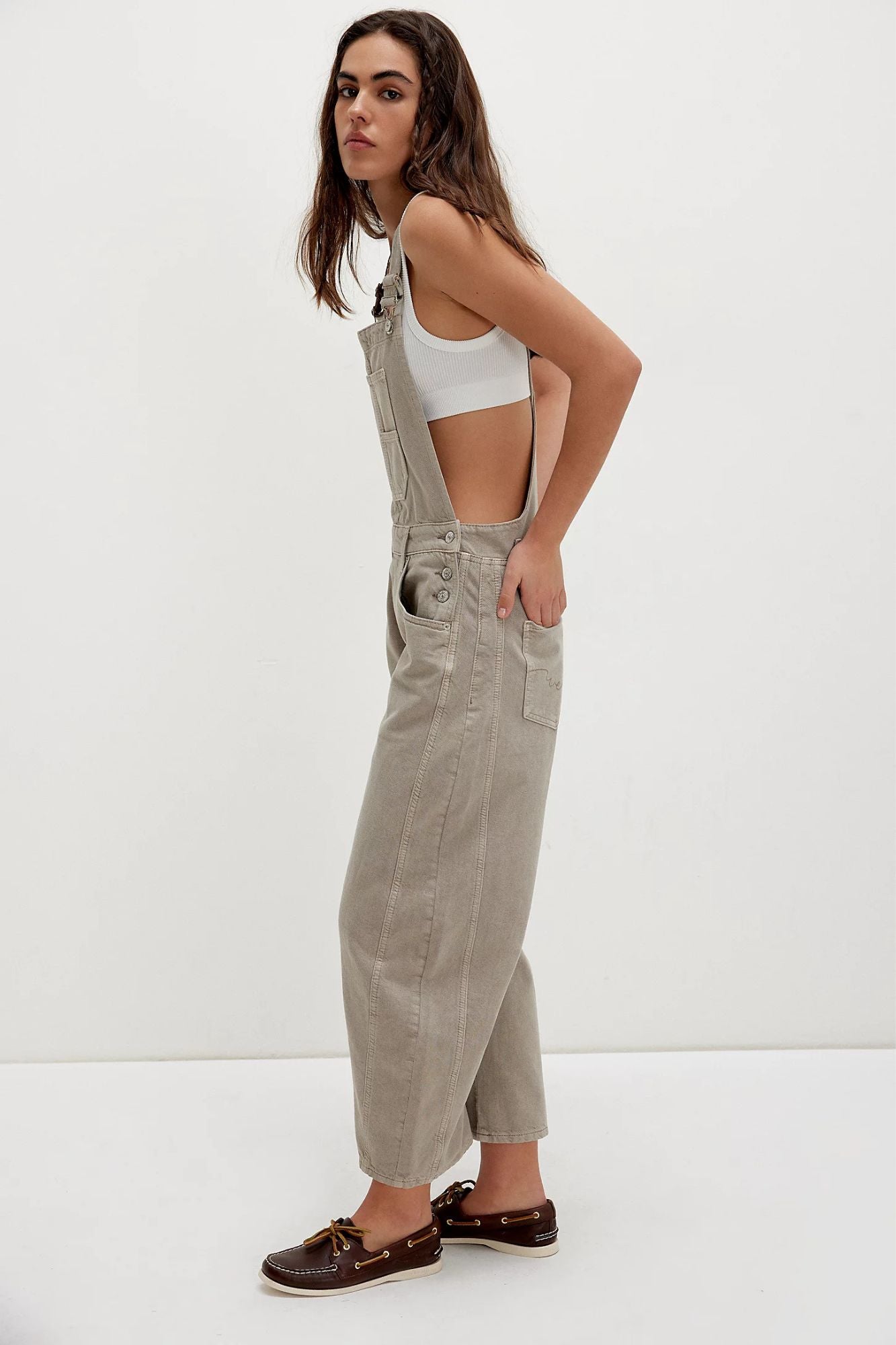 The Good Luck Overall offers a stylish bib-and-brace design paired with a wide barrel-leg for a modern twist. It includes a handy front bib pocket, tapered knees for a flattering fit, adjustable brace straps, and eye-catching side button details. Whether you dress it up with moto boots or keep it casual with sporty sneakers, this versatile piece adapts to your lifestyle, making it a must-have for effortless, everyday style.