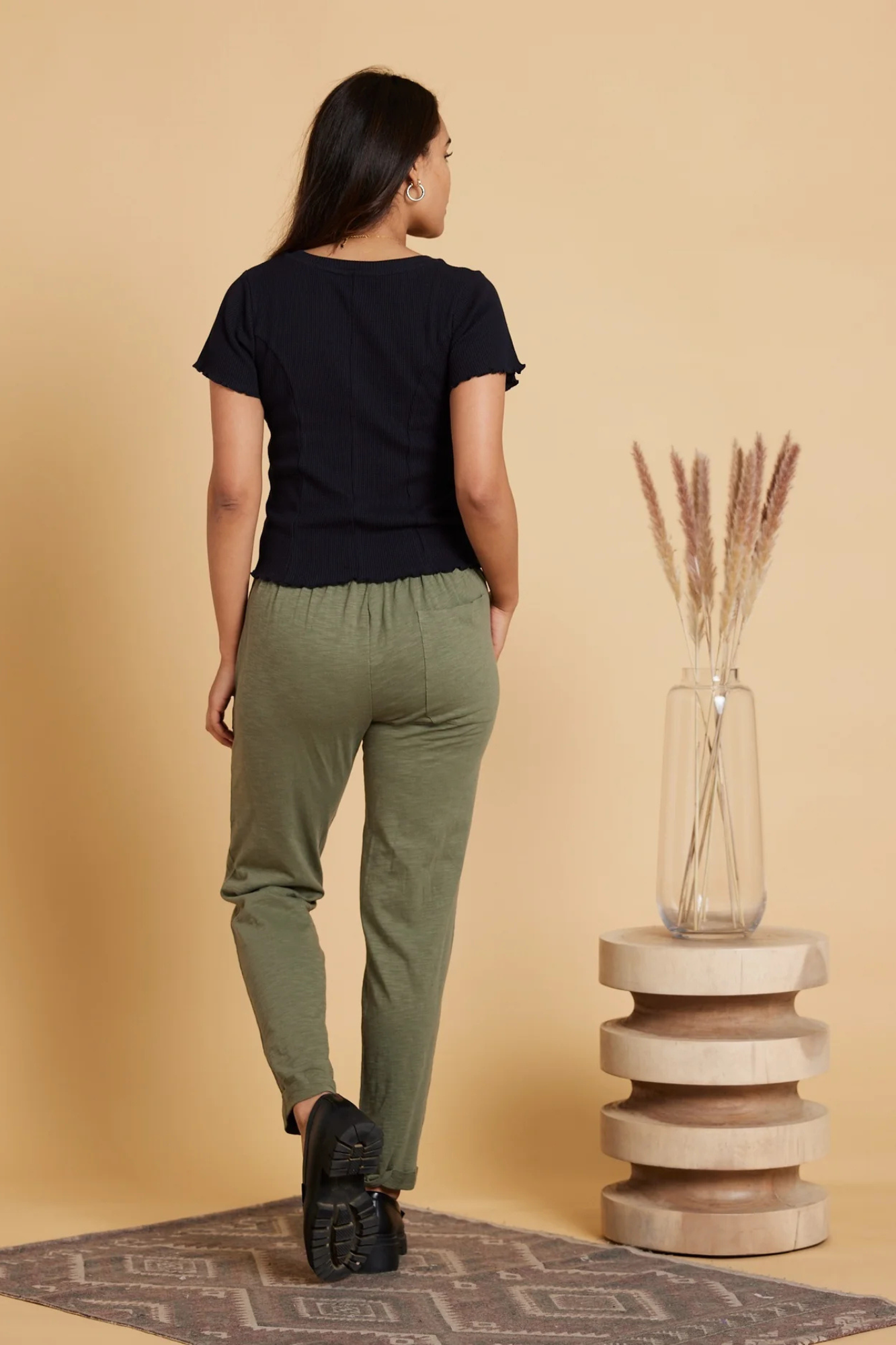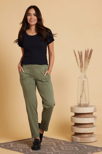 The Nolan Pant brings sleek style with playful practicality! These organic cotton bottoms feature an elastic waistband with up to 3 inches of stretch for that "just right" fit. Clean lines, convenient patch pockets, and a chic rolled hem make these pants your new go-to for looking put-together while feeling comfortably carefree.