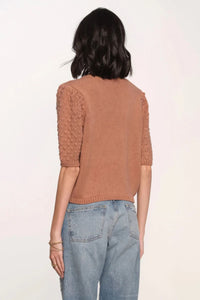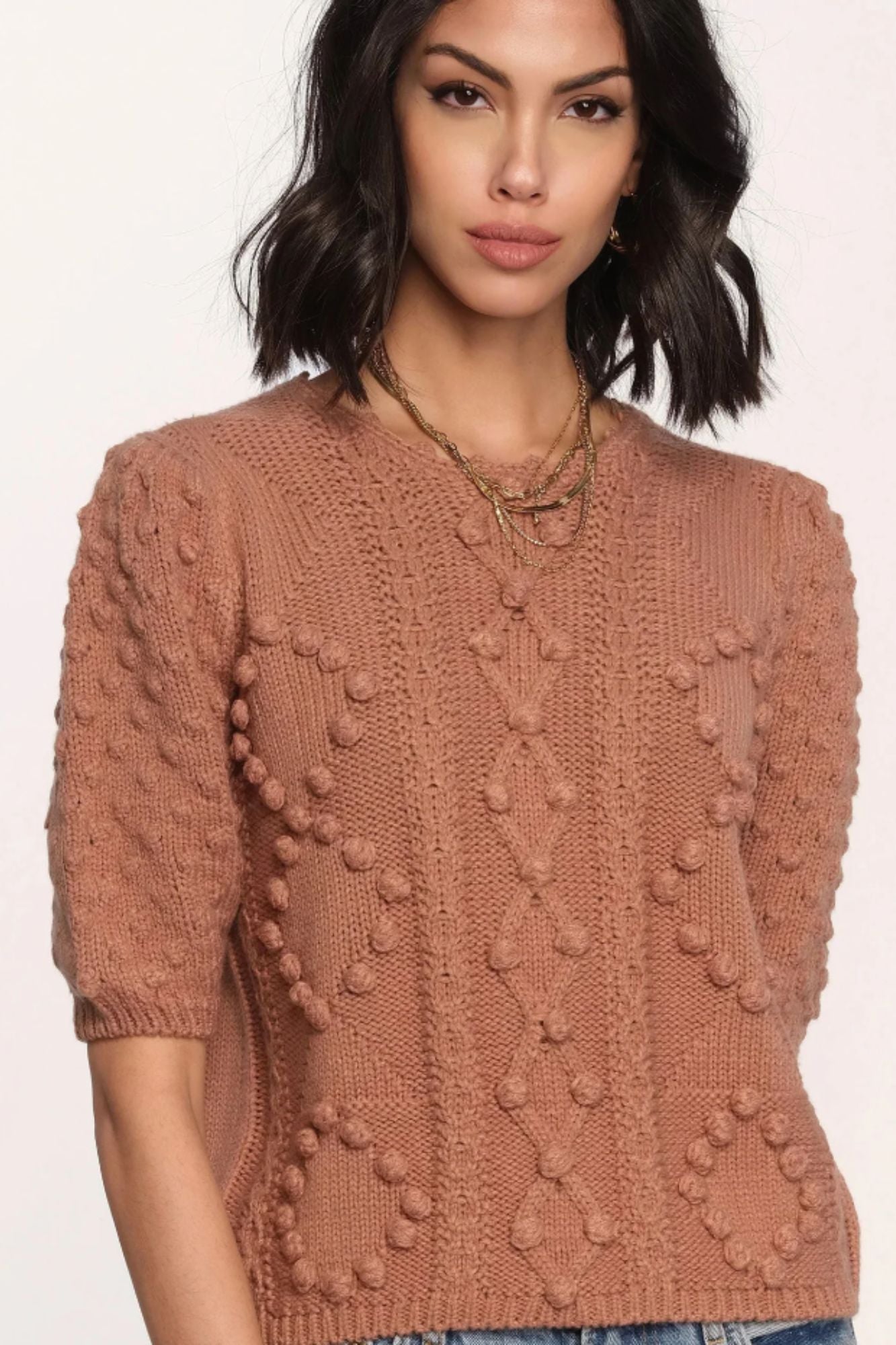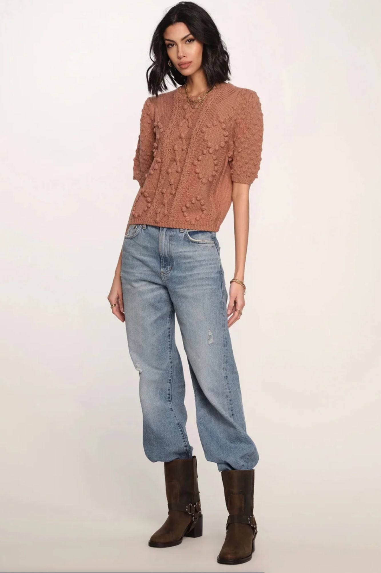 This Parmina Sweater features a chunky pompom design and delicate stitches around the neck, adding a touch of charm to its classic crew neck shape. Perfect for transitional seasons, this sweater pairs effortlessly with jeans for a stylish and cozy look.