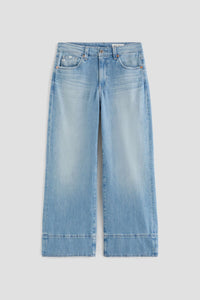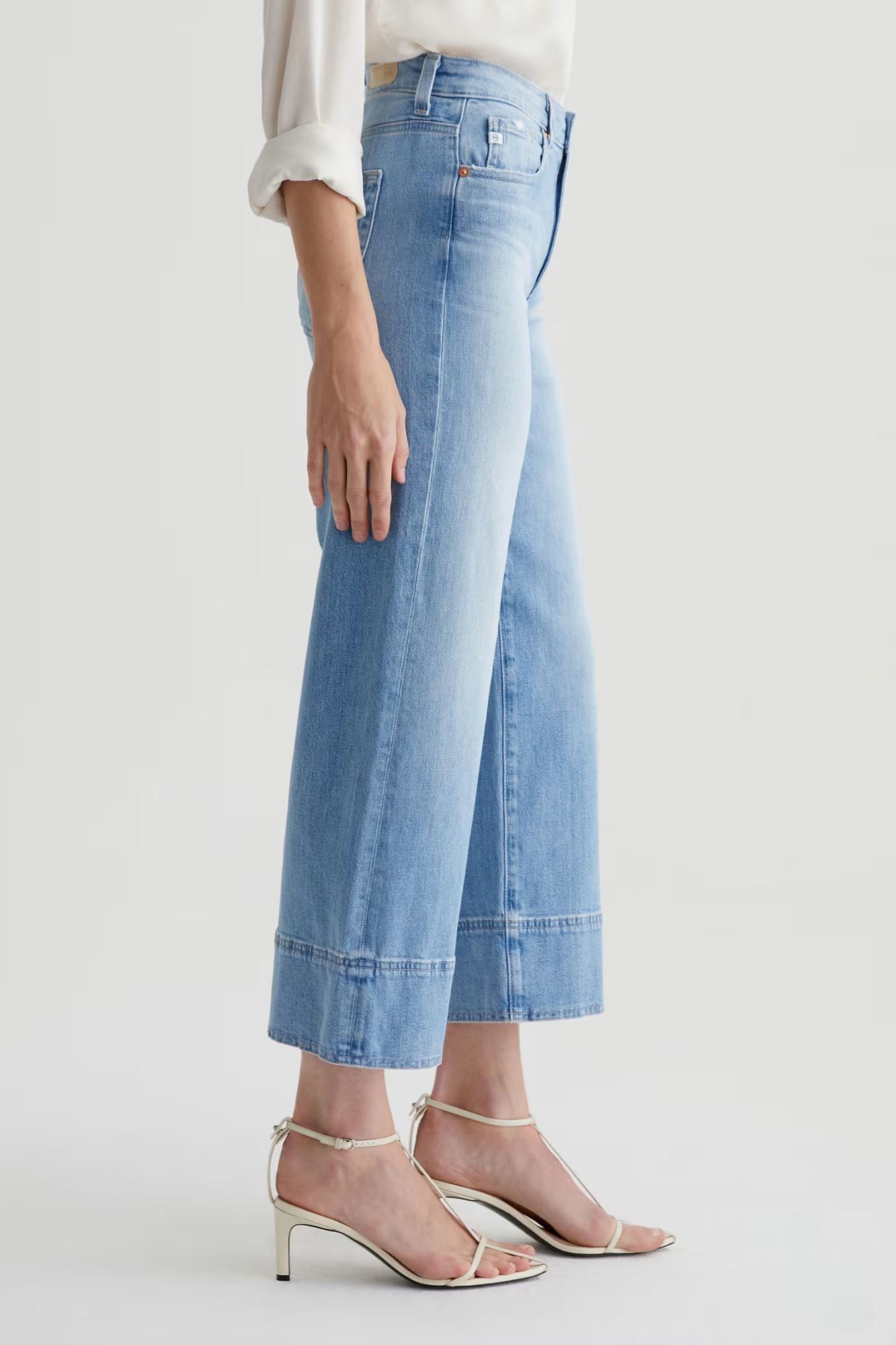 The Saige Wide Leg Crop features a mid-rise waist and a spacious silhouette updated with wide hems. Designed in stretch-blend Journey Denim from Italy, these cropped wide-leg jeans have a light wash with faded details and a touch of distressing at the pockets.