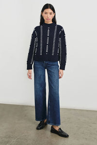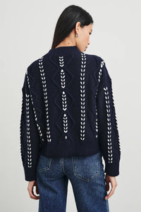 Expertly crafted with a heavy wool blend, the Tori Sweater features a white contrast ribbon stitch and ribbed mock neck for a sleek and sophisticated look. Its boxy fit adds a modern touch to the classic cable knit design. Stay warm and stylish with this elevated sweater.