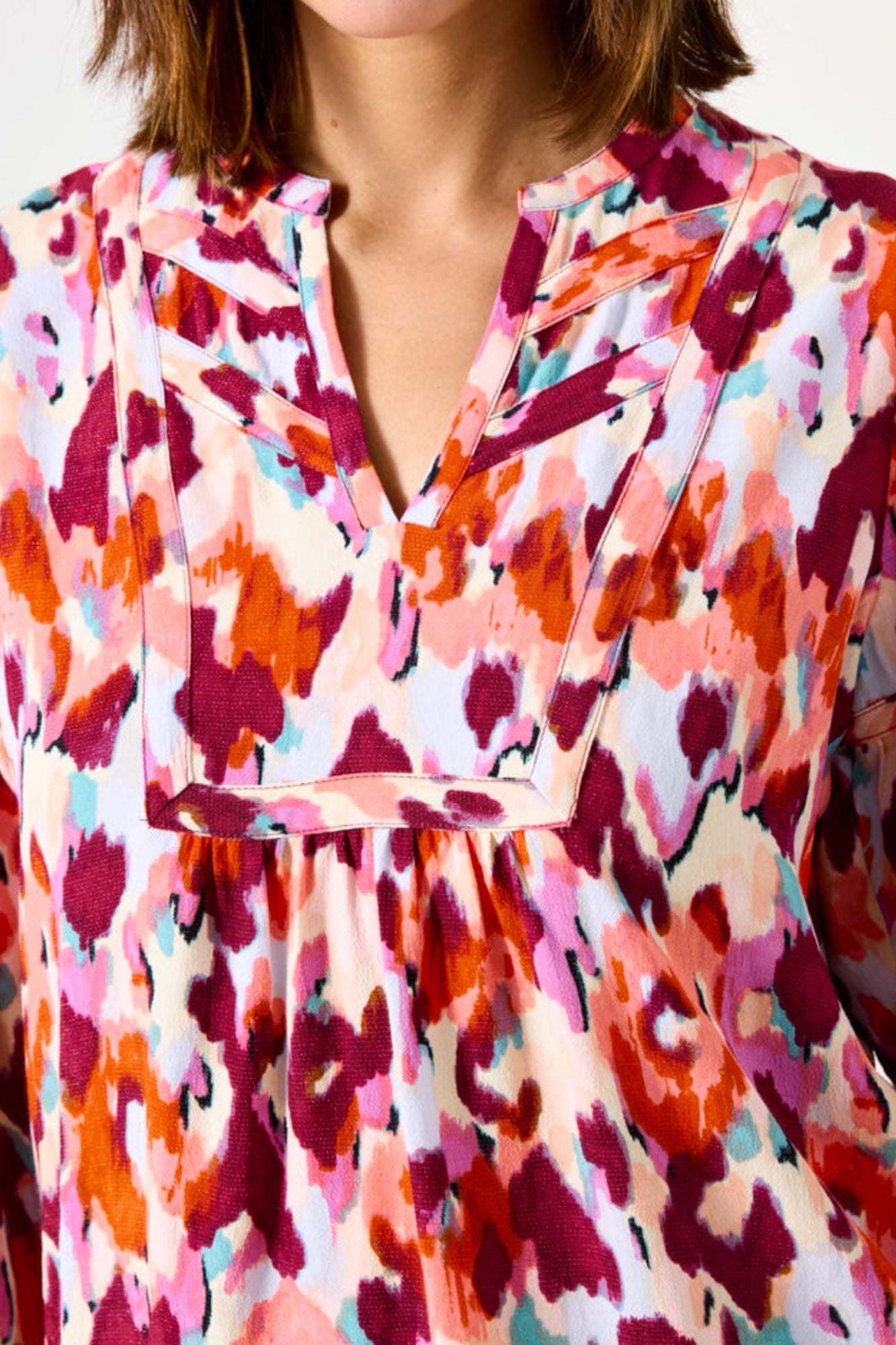 Shake up your wardrobe with the Penelope Top. Make a statement with this trendy crêpe blouse featuring a playful allover print. With its 3/4 sleeves, Y-neckline, and relaxed fit, this top is both stylish and comfortable. Upgrade your look with this must-have addition.