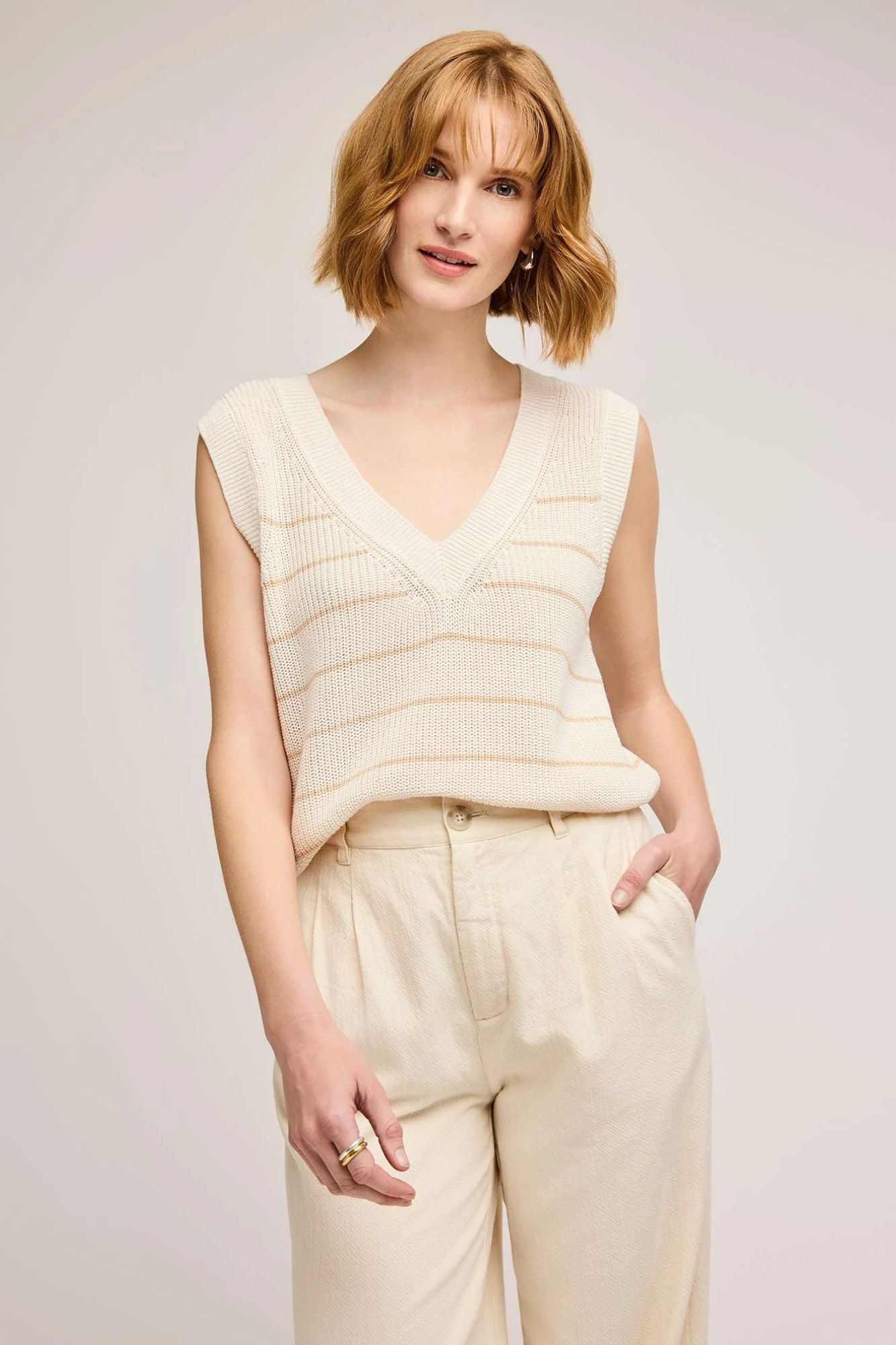 Get cozy and stylish with the Tanner Knit Vest. Made of soft yarn in a half cardigan stitch, this vest features a v-neckline and a trendy narrow stripe pattern. Stay warm and on-trend with this playful addition to your wardrobe.