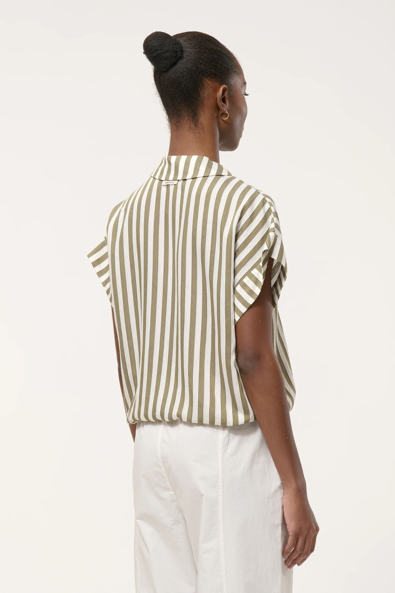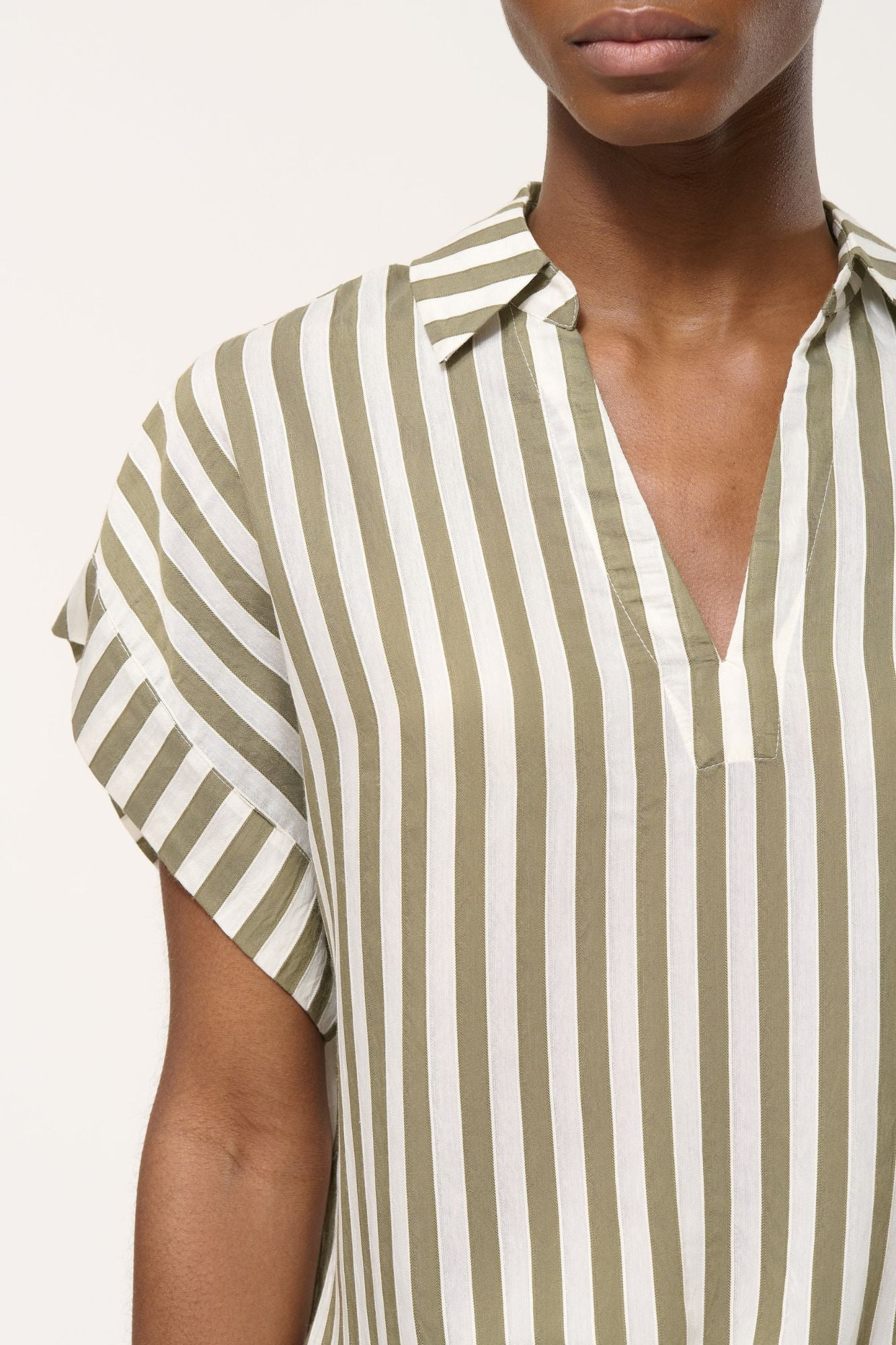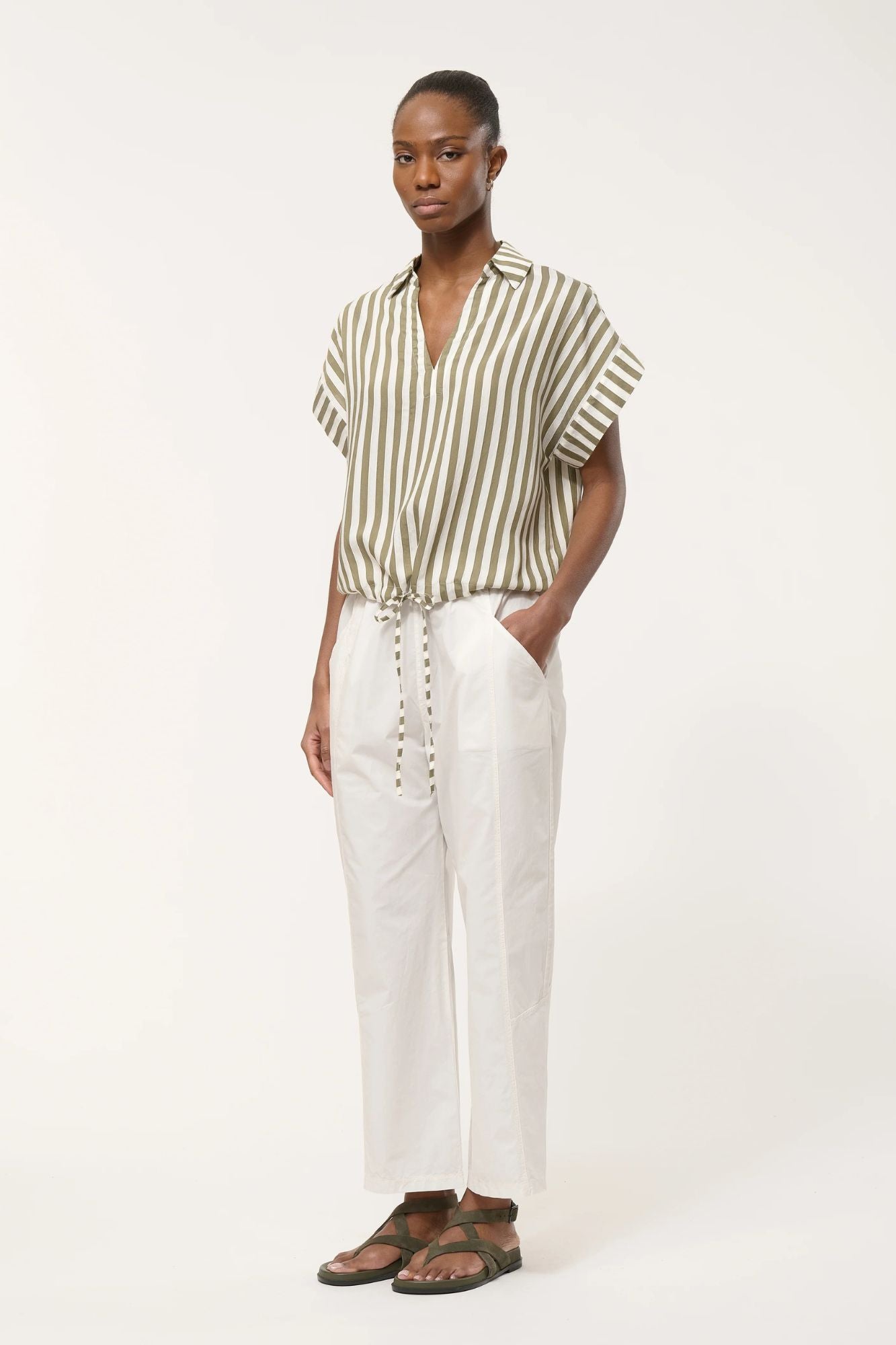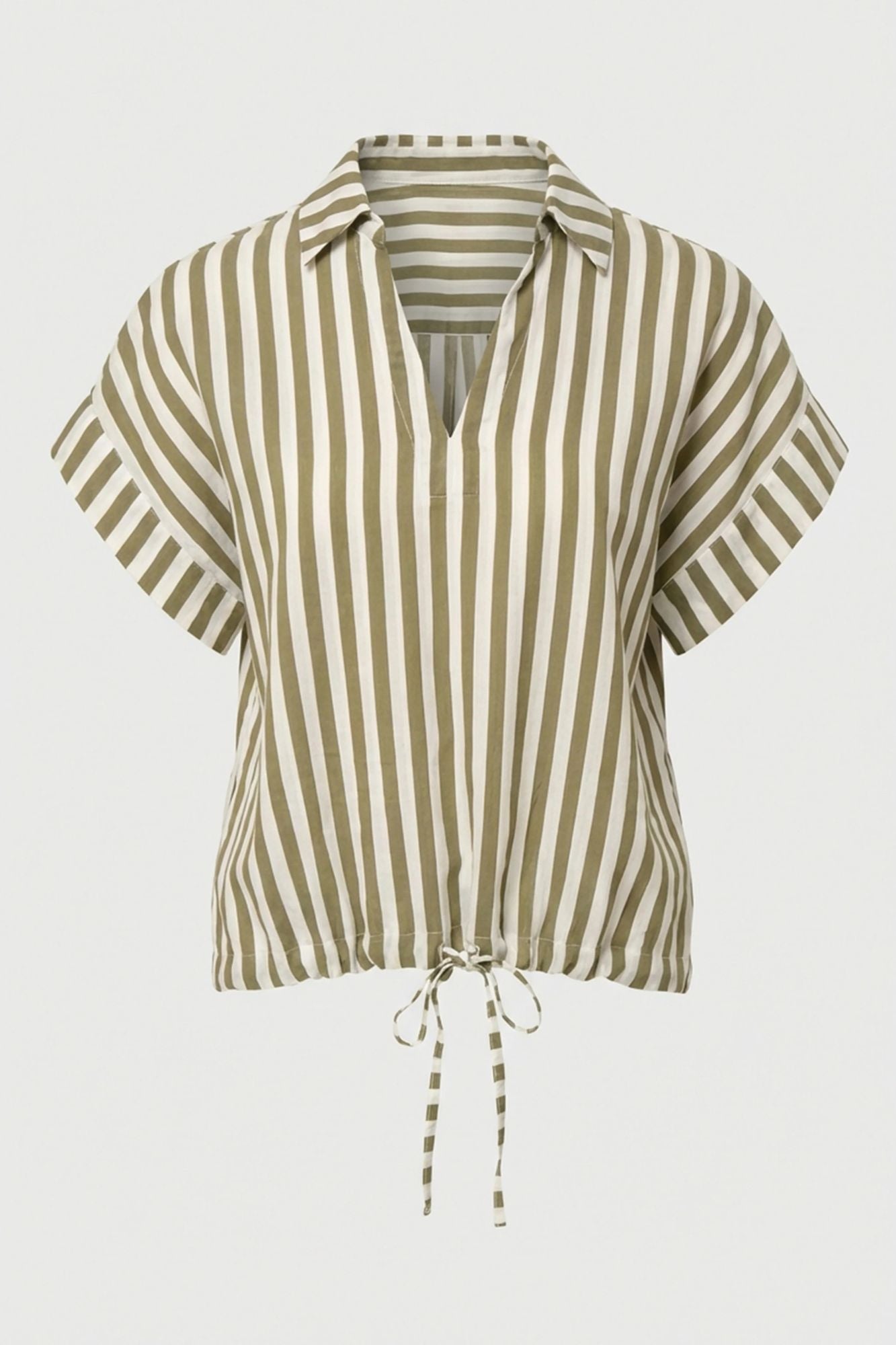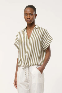 Effortless style meets comfort in this boxy top featuring bold textured stripes and a relaxed silhouette. The open polo collar adds a polished touch, while adjustable drawstring waist lets you customize the fit. Cap sleeves with contrasting wide hems complete the look with modern dimension. Perfect for layering or wearing solo.