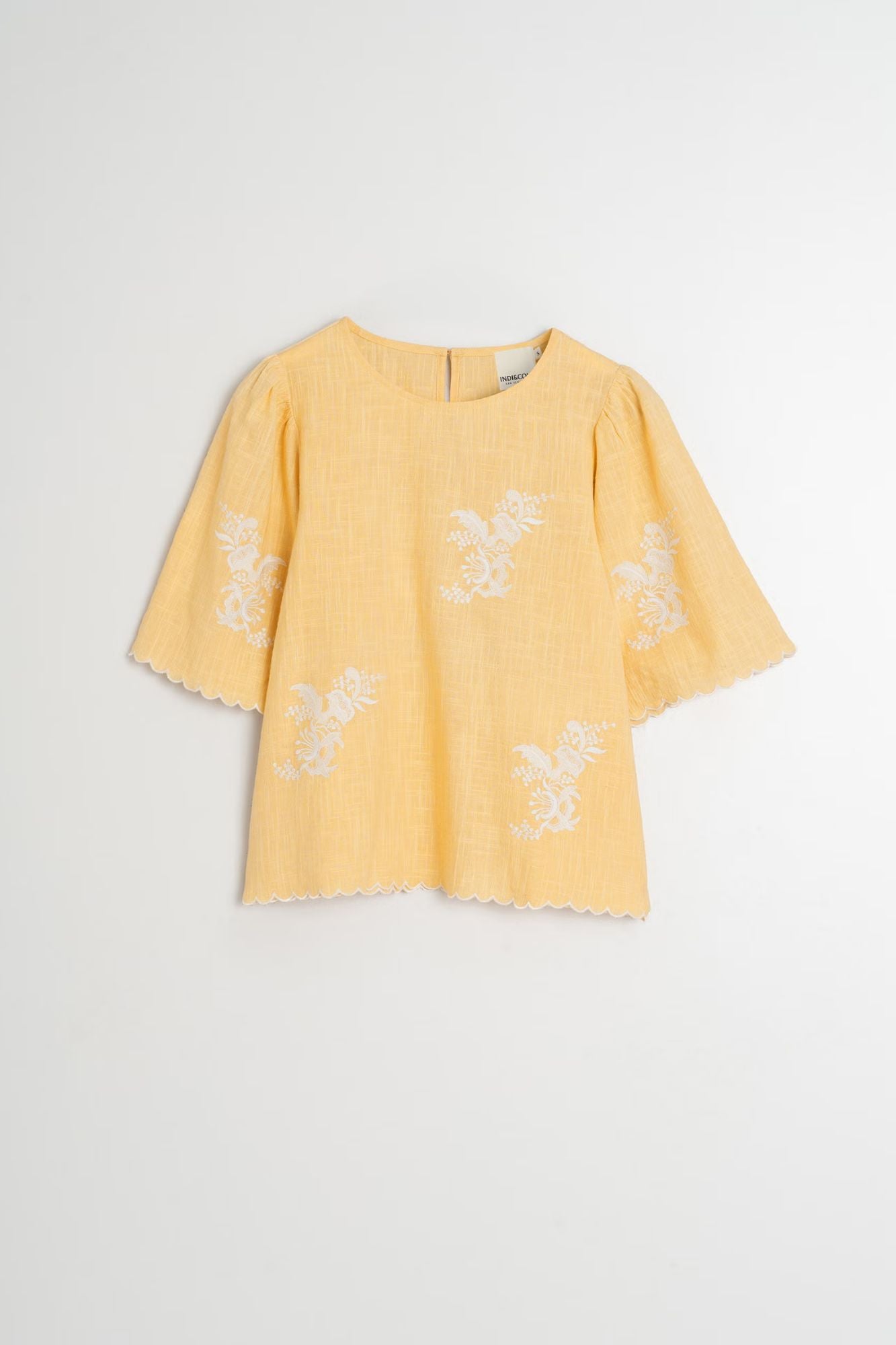 Add a touch of elegance to your wardrobe with our Butterfly Sleeve Blouse. Made from high-quality cotton, this special garment features contrasting floral embroidery and a square fit for a unique look. The butterfly sleeves with scalloped finish add a feminine touch, making it perfect for any occasion.