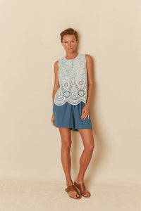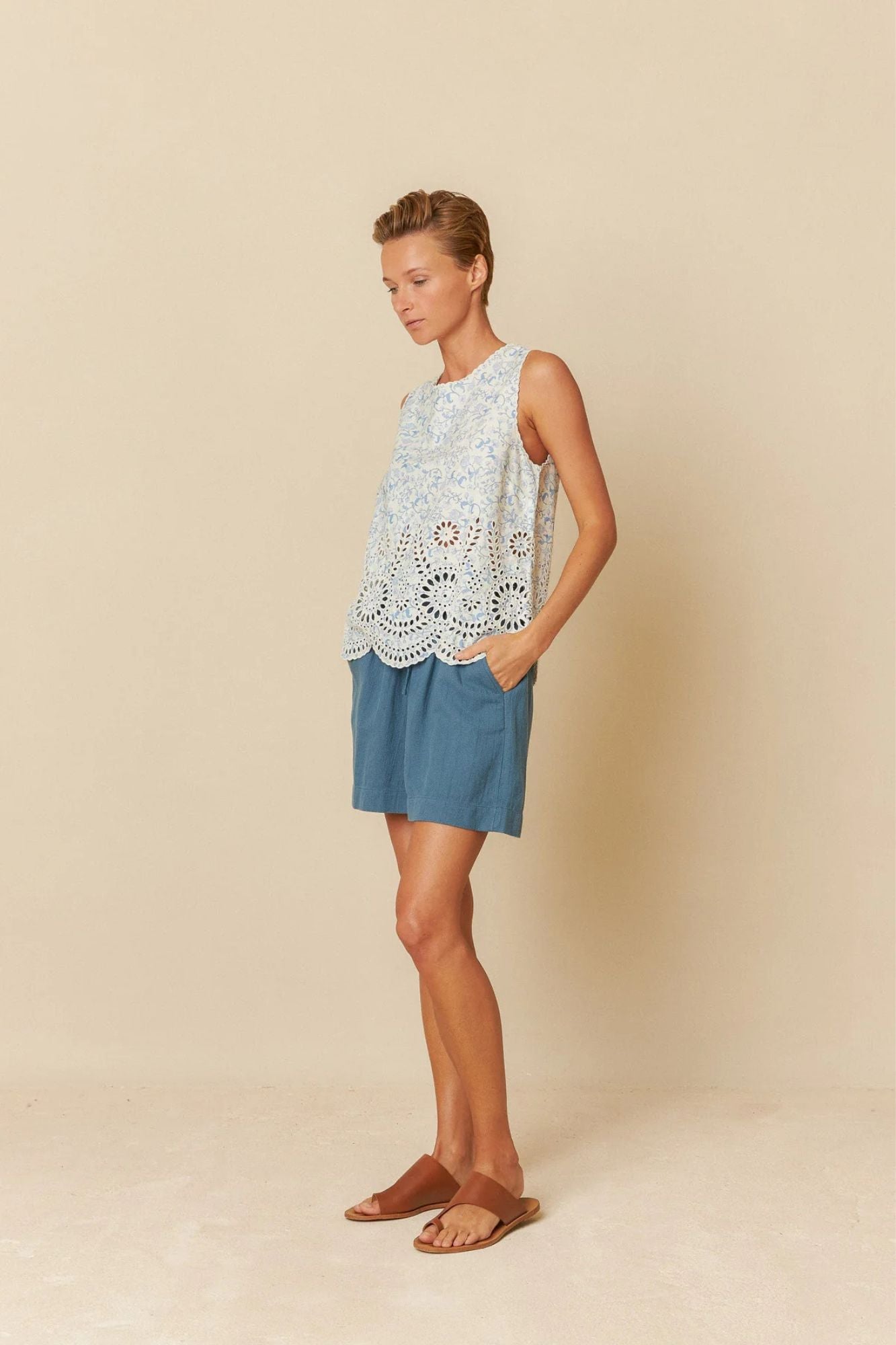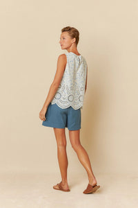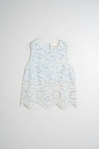 Feminine and fun, this Printed Camisole with Eyelet Hemline is perfect for sunny days. The delicate floral print and lace details add a touch of charm, while the round neck and buttoned back give it an elegant twist. Pair with high-waisted jeans or a flowing skirt for an effortlessly chic look.