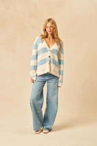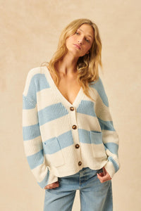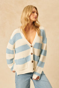 Indulge in effortless style with the Mckay Cardigan. Featuring soft blue stripes and contrast buttons, this chic yet cozy cardigan is perfect for any occasion. Keep your essentials close at hand with the convenient front pockets. Stay warm and fashionable with the Mckay Cardigan.