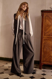 Elevate your wardrobe with the Gina Pants—a timeless wide-leg silhouette that commands attention. Featuring a high-waisted design with a structured belt loop, these pants offer a flattering, elongating effect. The front pleats add sophisticated volume and movement, while the flared fit creates an effortlessly chic line from hip to hem. Practical side pockets keep essentials within reach, and the secure zip and button fly closure ensures a polished finish. Perfect for dressing up or down, the Gina Pants deliver versatile style with undeniable presence.