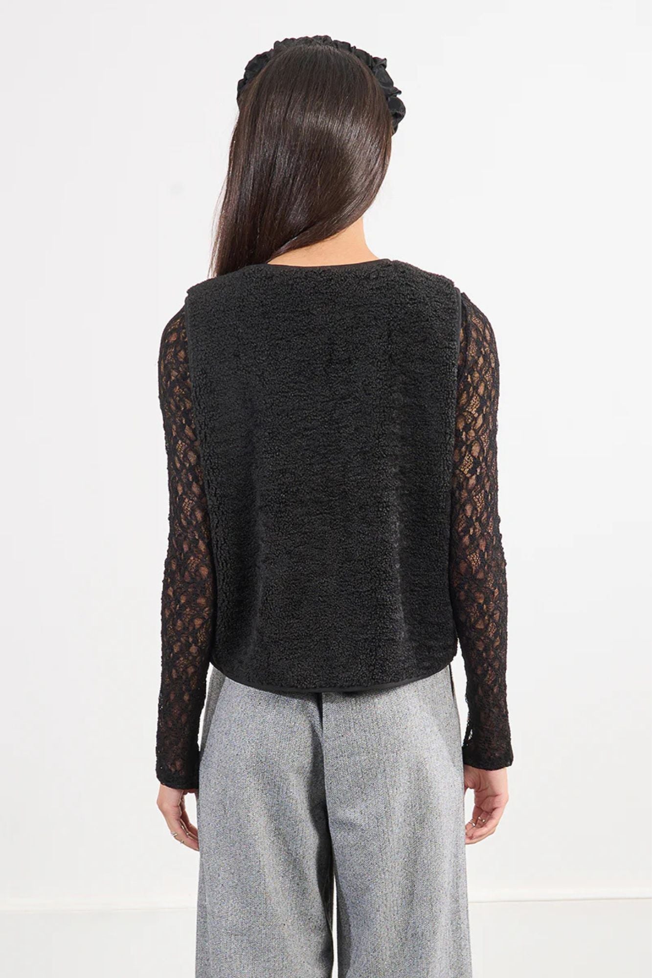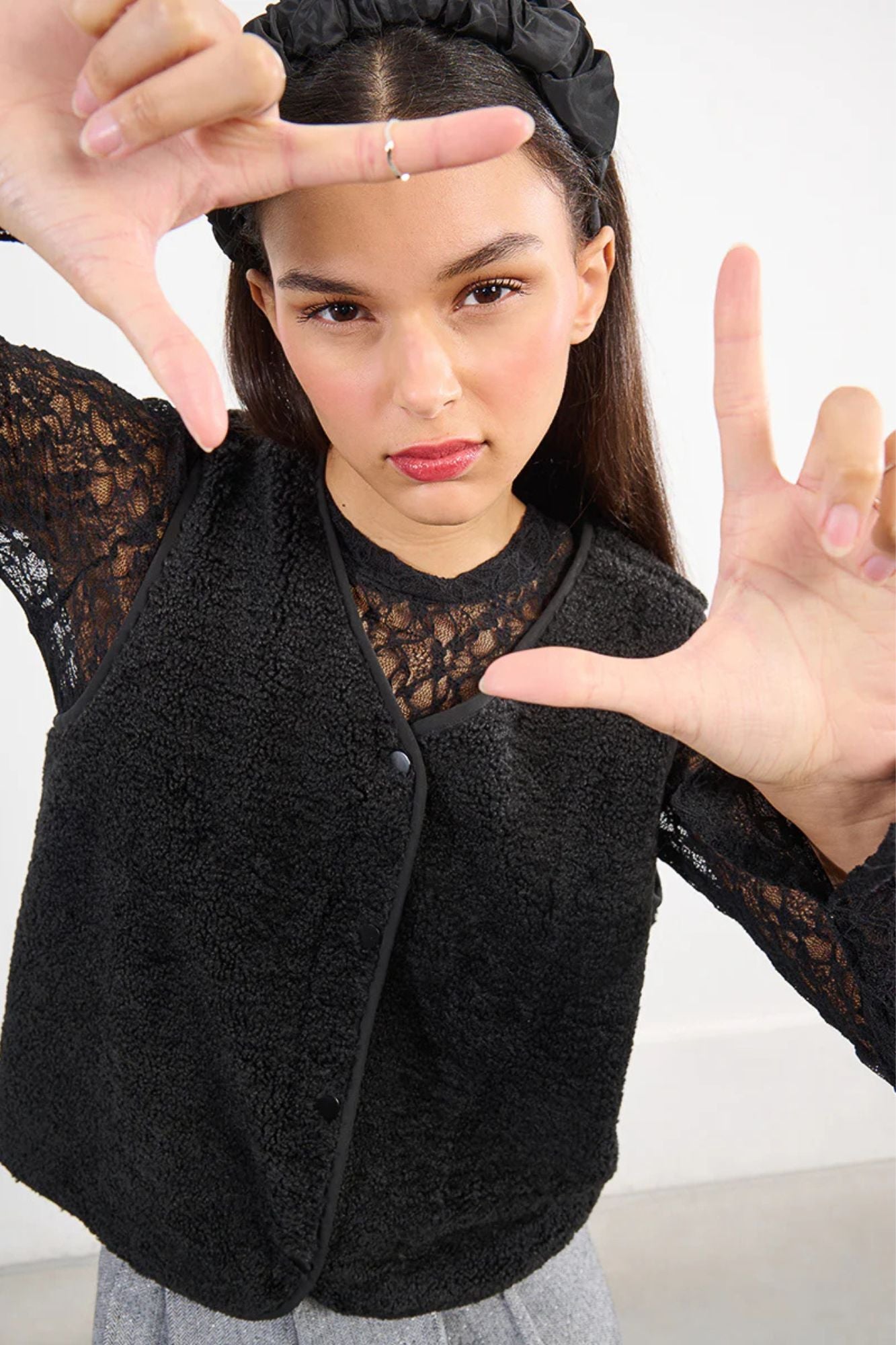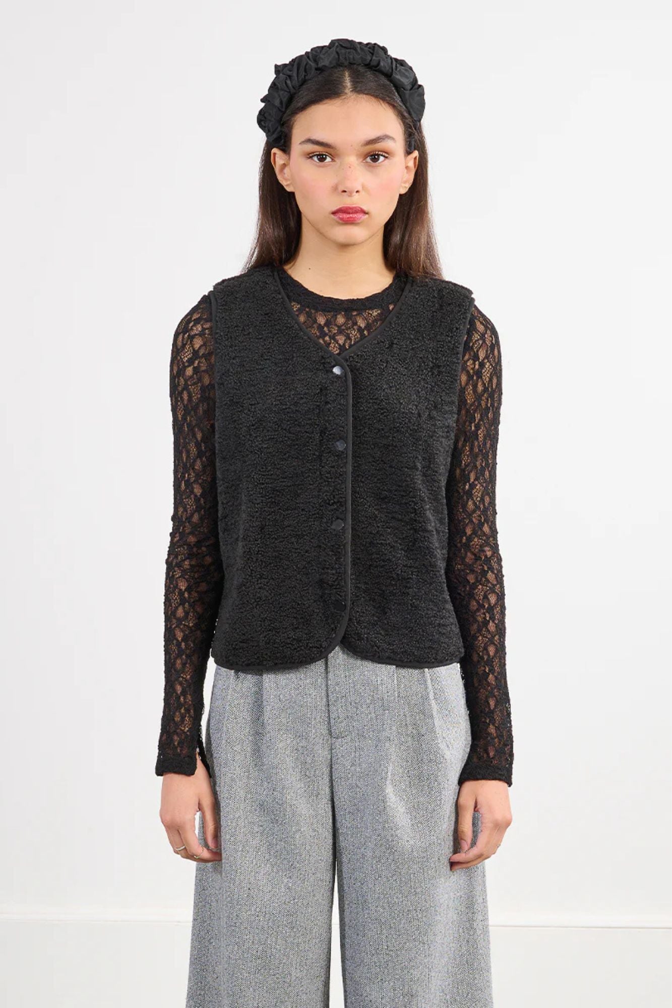 Layer up with the Sonya Vest, your new go-to for effortless cool. This oversized sleeveless piece features a chic imitation button mesh design that adds texture and visual interest to any outfit. The round neckline and snap button closure down the front make it easy to slip on and style, while the straight fit keeps things relaxed and comfortable. Perfect for throwing over your favorite tee or dress.