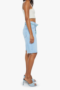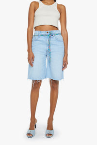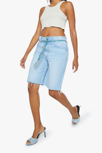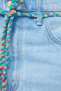 Embrace bold style with the Shoelace Fun Dip Short Fray from SNACKS! These denim bermuda shorts feature a relaxed, wide-leg fit designed to sit loose and low on the hips for effortless comfort. Crafted from a recycled cotton blend in a light blue wash with subtle fading and whiskering, they showcase a frayed hem and a vibrant knit belt for a playful touch. Details like a pretzel-shaped button and candy-inspired rivets add unique charm. Perfect for those who dare to stand out with experimental, non-era-specific fashion. Would you like a treat?