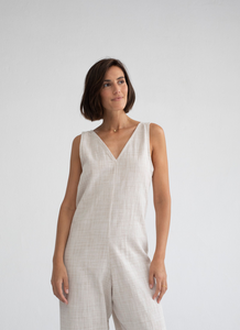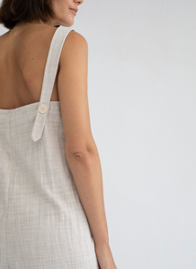 Mus & Bombon women's button strap jumpsuit. Long jumpsuit with wide straps and V-neckline. Bust darts and invisible zip. Adjustable shoulder straps with two eyelets with button at the back of the jumpsuit.