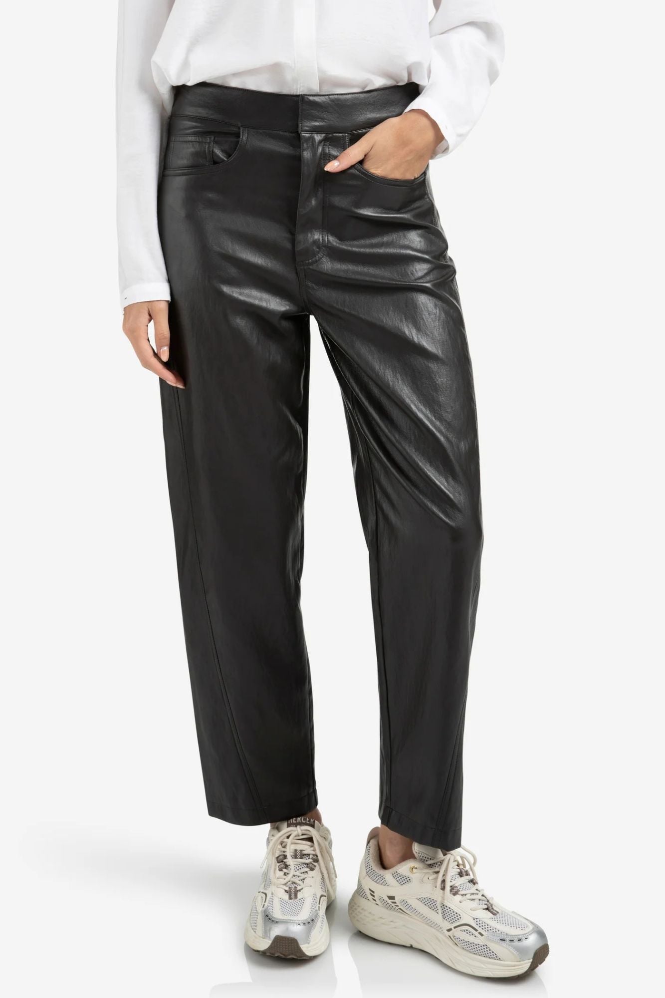 These Faux Leather Carrot Fit Trousers combine modern style with comfort. Crafted from supple faux leather, they offer a high waist and slim tapered legs that flatter your silhouette. The relaxed fit around the hips provides ease of movement, while front slit and patch back pockets add practical detail. Decorative seam accents and a subtle sheen elevate the design, making these trousers a chic addition to any wardrobe. Perfect for a polished yet edgy look that transitions effortlessly from day to night.