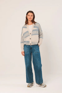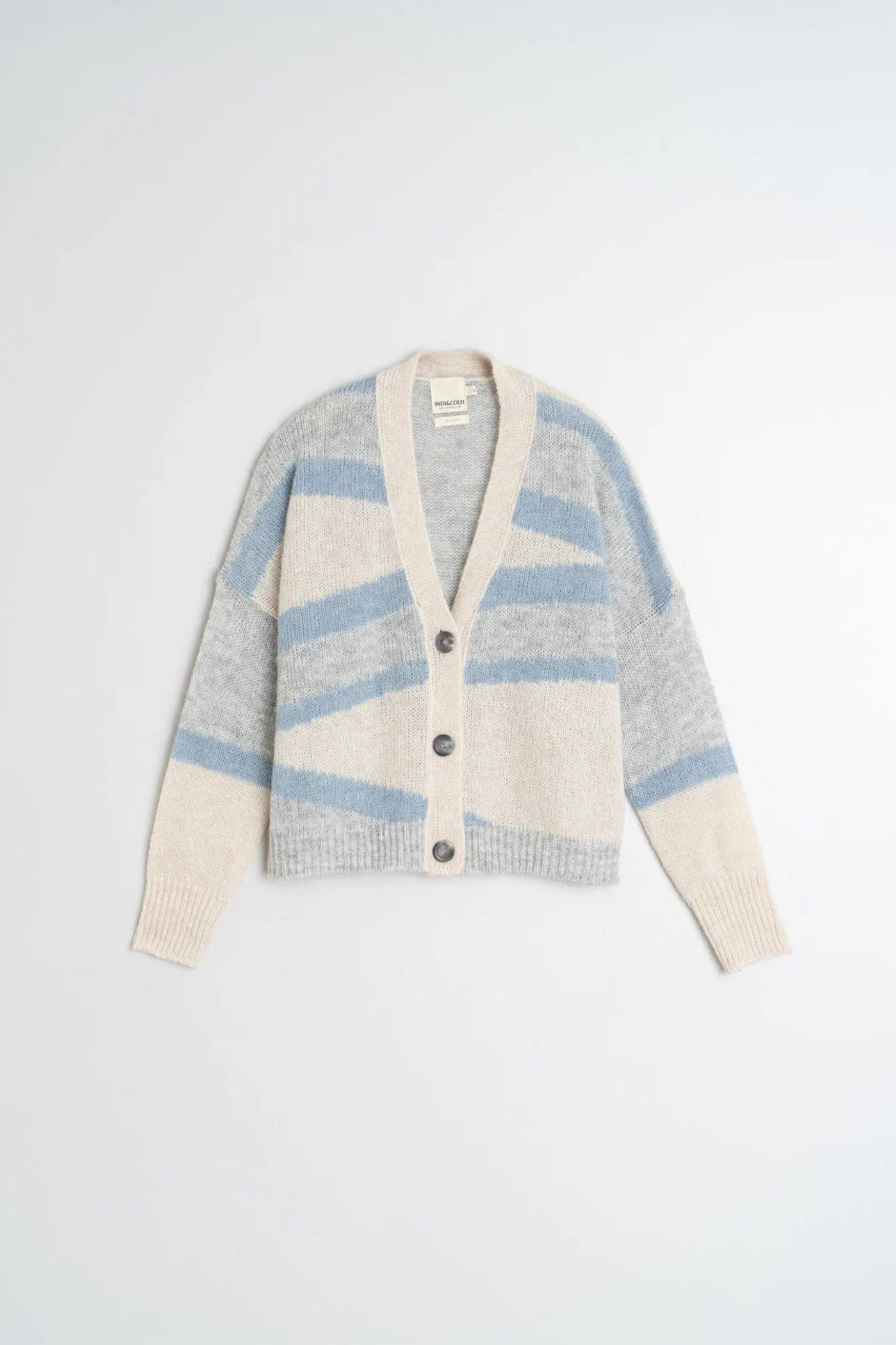 Add a touch of unique charm to your wardrobe with our Intarsia Alpaca Cardigan. This cozy and warm sweater features tricolor intarsia design and is crafted with luxurious alpaca wool. Perfect for cold days, it boasts a V-neck, dropped shoulders, and long sleeves with a central button closure.