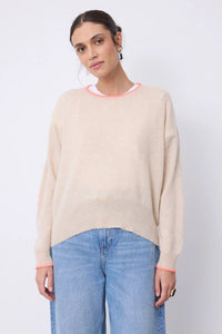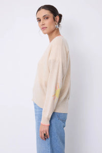 Elevate your everyday wardrobe with the Charlie Sweater, a luxurious women's jumper crafted from 100% cashmere. This timeless piece features a classic round neckline and long sleeves finished with refined ribbed edges for a polished look. The straight-cut silhouette offers effortless comfort and versatility, while distinctive elbow pads adorned with a sun motif add a touch of personality. An embroidered stitch detail at the neckline completes the sophisticated design. Perfect for layering or wearing solo, this investment piece delivers softness and style season after season.